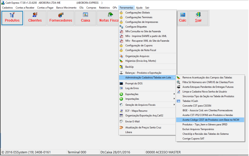 O CEST é r eódigo especifocador da Substituição Tributária, e semTre está relacionado oo NCM do produto em questão. Para ajudar no dia a dia criamos uma forma de cadastrar o código CEST dos seus produtos em lote, siga o passo a passo abaixo e veja como realizar esse procedimento. 1-Abra o VCASH > Ferramentas > Administração de Cadastros/Tabelas em Lote > Acerta Código CEST de Produtos com Base no NCM;