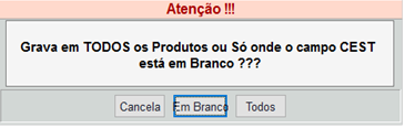3-Escolha estre as opções, Em Branco ou Todos. Em Branco, fará com que seus produtos que estão com o campo CEST em branco sejam preenchidos conforme o NCM cadastrado. A opção Todos fará com que o sistema preencha todos os produtos, ate os que já estão preenchidos anteriormente.