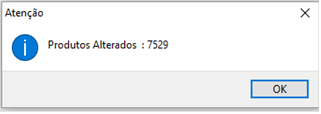 4-Observe que o sistema retorna uma mensagem informando a quantidade de produtos alterados, agora clique em OK para finalizar o procedimento.