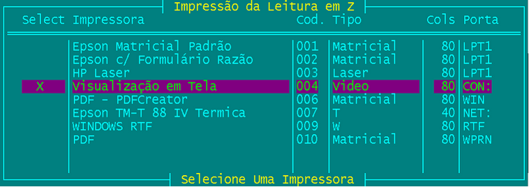 7 – Após confirmar, será pedida a impressora (apenas para terminais sem ECF). Selecione e a Leitura em Z será impressa.