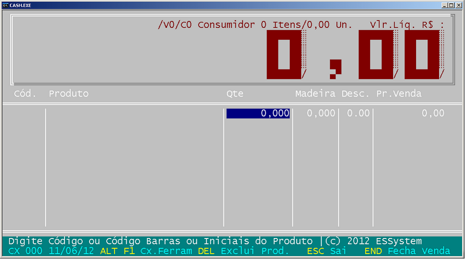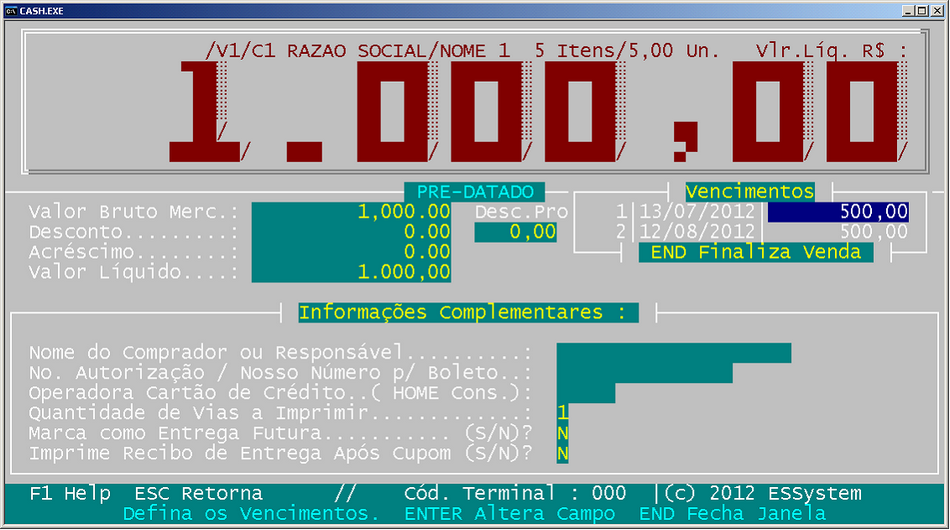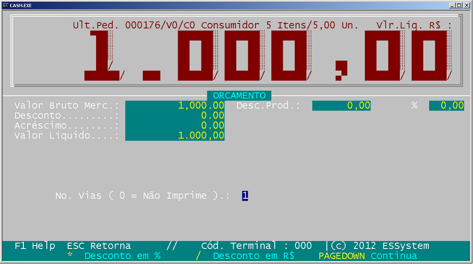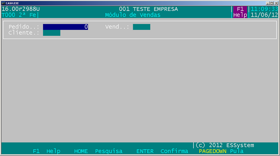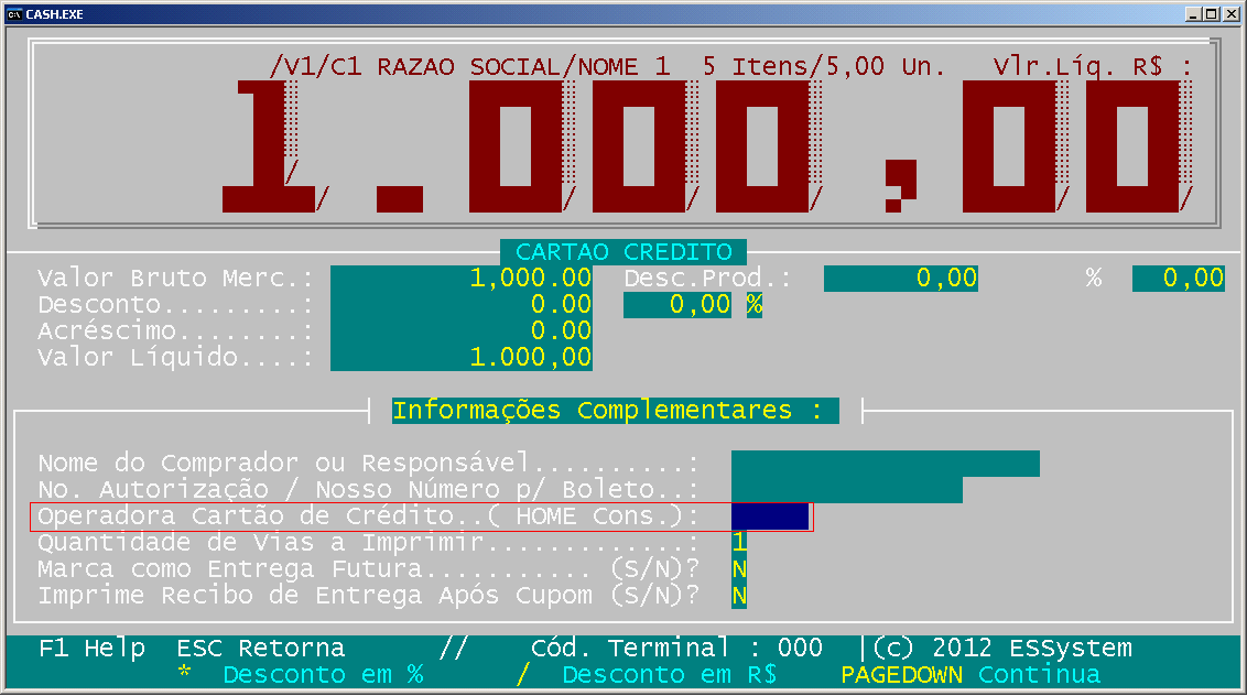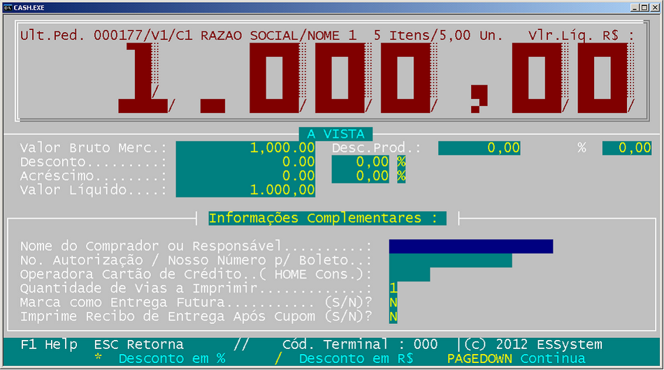 Vend. – pressione “HOME” para pesquisar em seu cadastro de usuários. Não é obrigatório, mas fornece diversos controles e relatórios de vendas por vendedor.