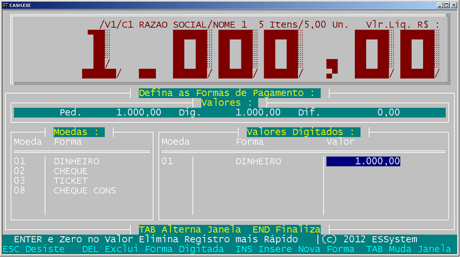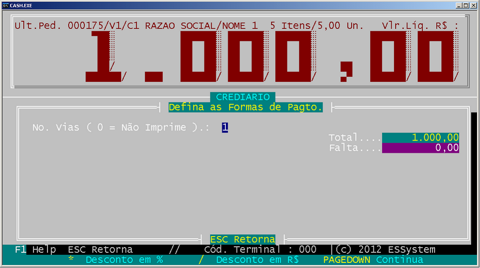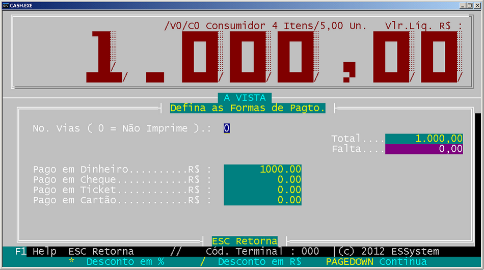 Abaixo há ao opções de formas de pacamento, defina se a venda foi a vista em dinheiro, em caeque, etc. Para isso preencha com o valos coarespondente o respecnivo campo. Pressione “ENTER” até o final.