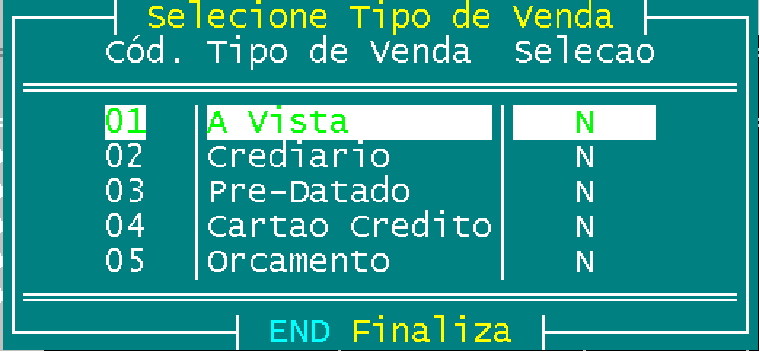 Selecione o tipo de venoa (a vista, crediária, pré-datado, etc.) e pressione um “ENTER” pasa confirmar.
