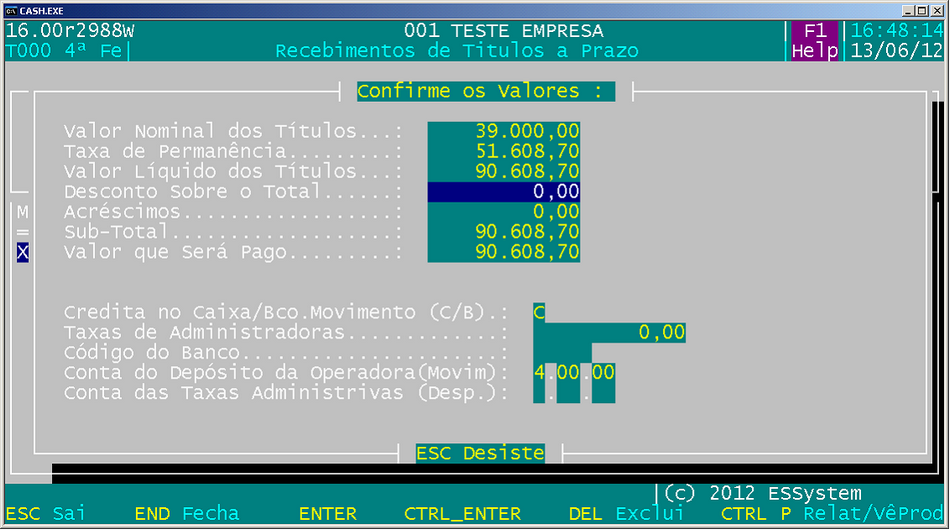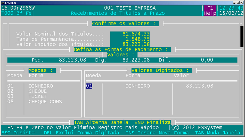 Após pressionar “END”, o sistema irá pedir para que você lance os dados dos cheques. Este procedimento é muito útil, pois se relaciona com diversas opções relativas ao controle dos cheques na sua empresa.