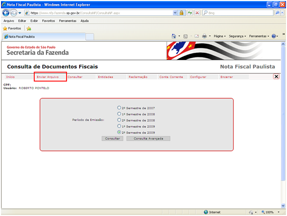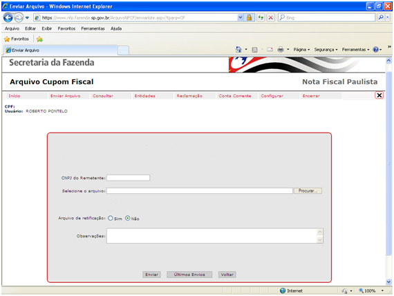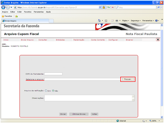 Ao clicar no link Enviar Arquivo, irá surgir a seguinte página web.