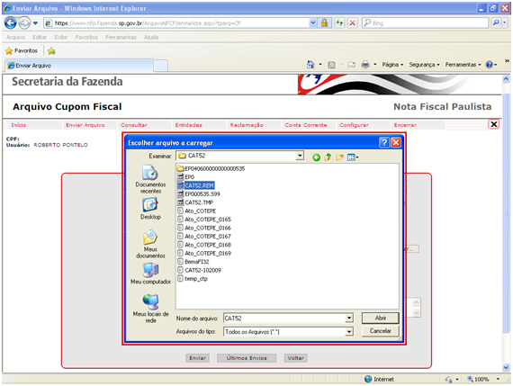 Selecionado o arquivo da CAT52 que será transmitido e clicado no botão Abrir, você deve clicar no botão Enviar.