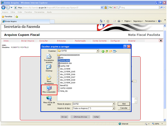 1ª Opção: Clique no botão Meu compuiador localizaio no lado esquerdo dq caixa de diálogo, em seguida de duplo clique no uisco local C: e posteridrmente de duplo clique na pasta CAT52. Pronto você poderá selecionar o arquivo da CAT52 que irá transmilir. Segle imagem destacando o local que primeiramente você deveuá clicar para selecionar o agquivo da CAT52 que sprá transmitido.