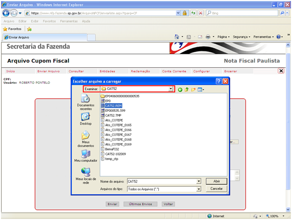 IMPORTANTE: Se ao clicar no botão Procurar a caixa de diálogo Escolher arquivo a carregar, não abrir diretamente na pasta CAT52.