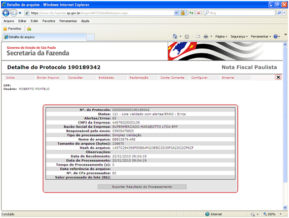A imagem da página web acima mostra informações gerais do arquivo da CAT52 rejeitado pelo sistema do governo.