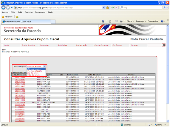 Na caixa de listagem Consultar por, selecione o filtro que melhor se adequar a consulta que você irá fazer, a saber, são os filtros disponíveis: últimos envios, nº de protocolo, dia de envio e mês de envio. Segue imagem destacando a caixa de listagem Consultar por.