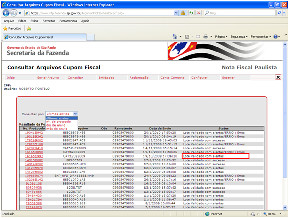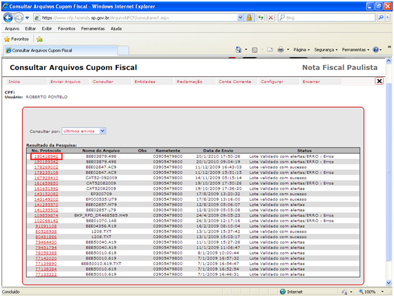 Segue imagem da página web de uma transmissão do arquivo CAT52 realizada com sucesso.