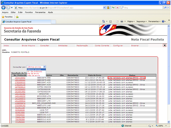 Nos casos em que o status da transmissão do arquivo dor validado com alertas/ERRO, você deverá clicar no Nº Protocolo. Segue imagem da página web, destacando o local que você deverá clicar.