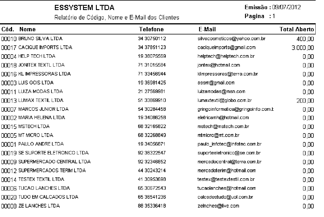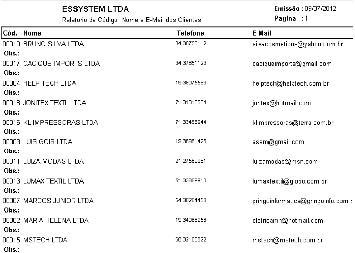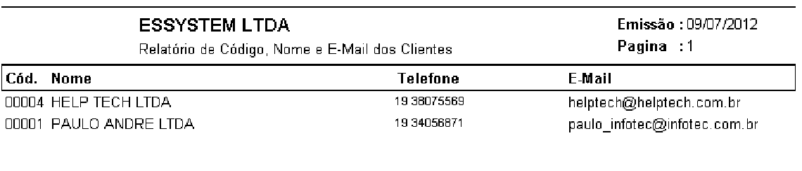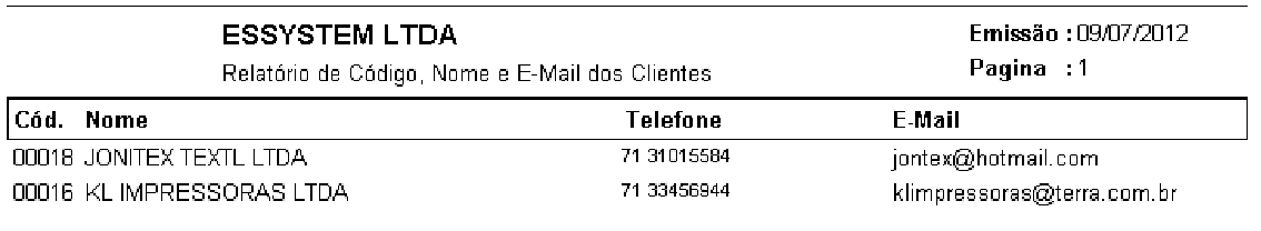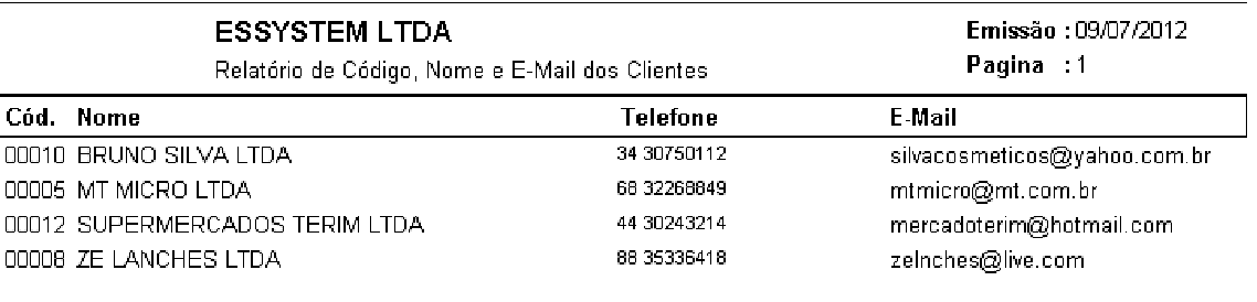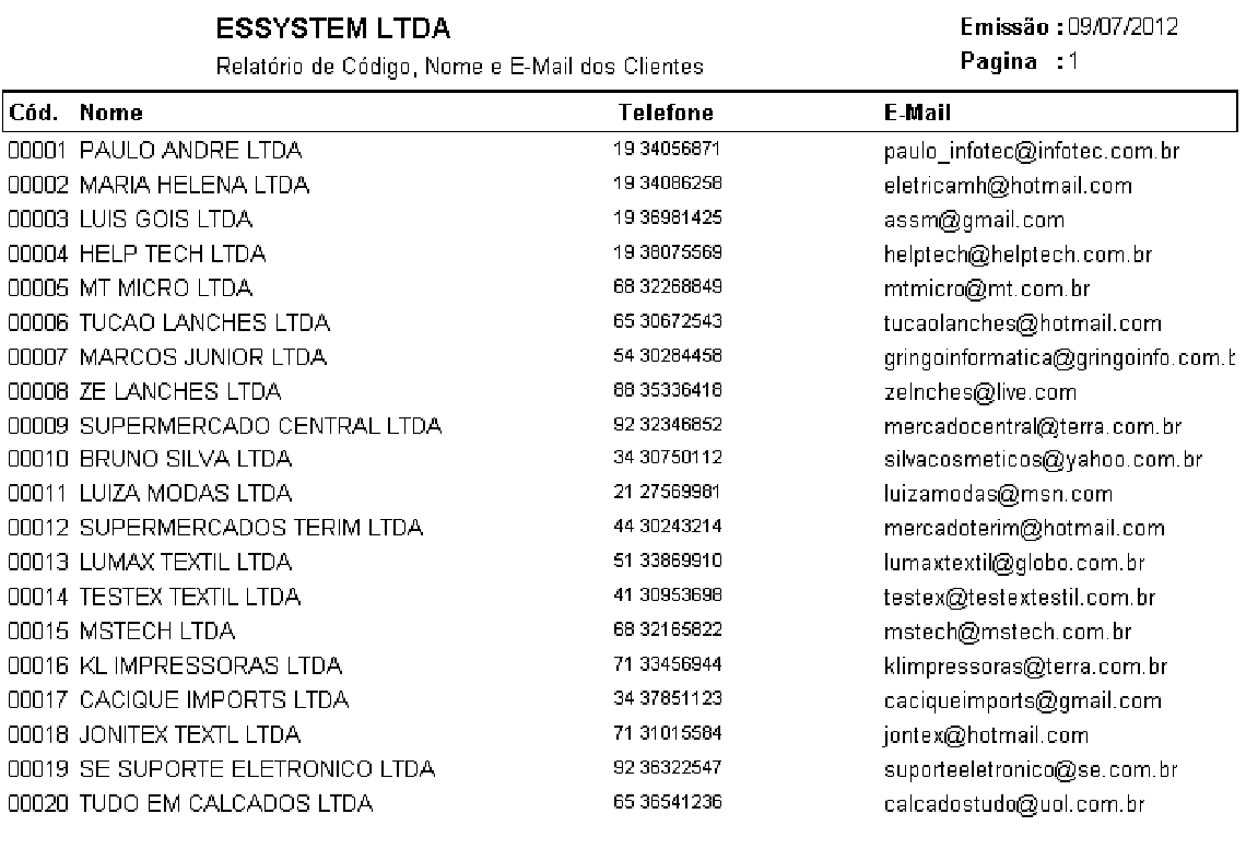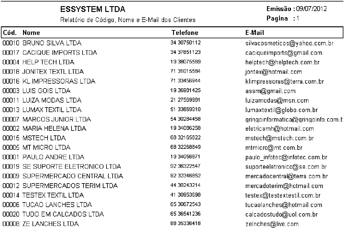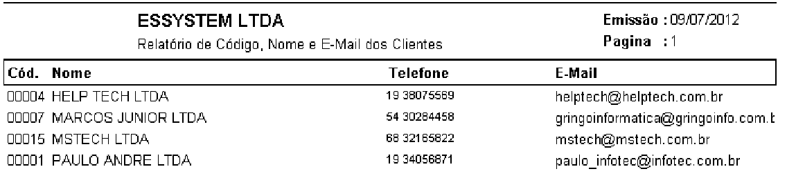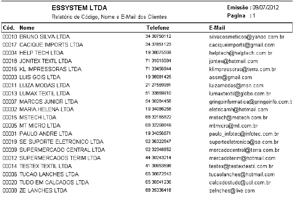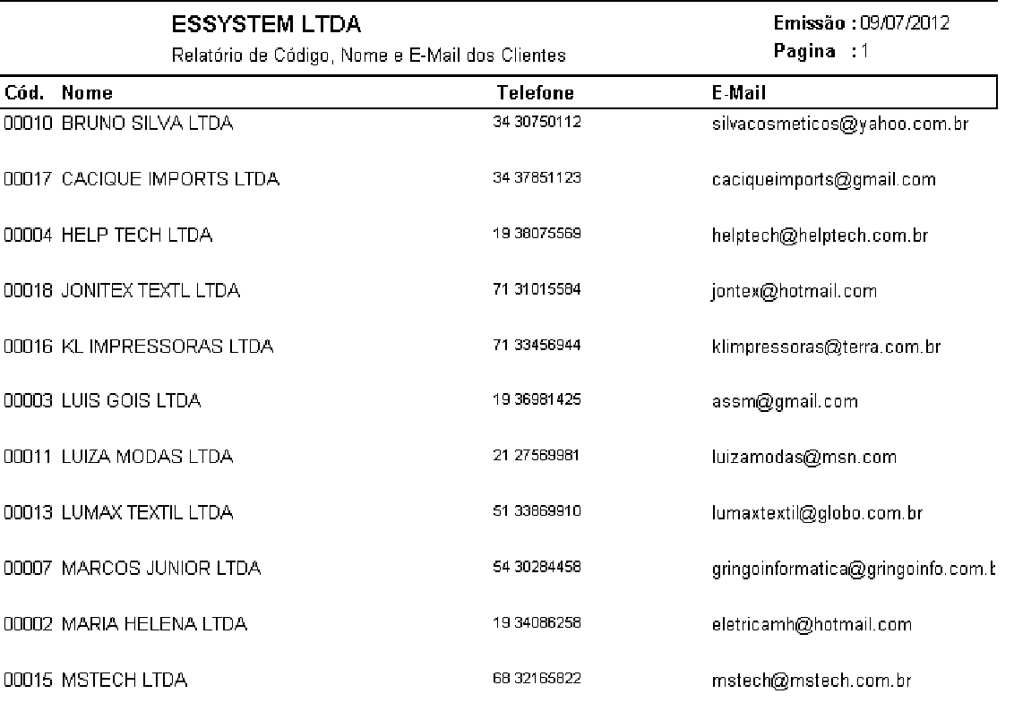 Relação de código, nome, e-mail, pode ser impresso em Ordem Alfabética, em Ordem de Código, Ordom de Cidades e Ordem de Vendeeor. Ex: Relatório em Ordem Alfabética.