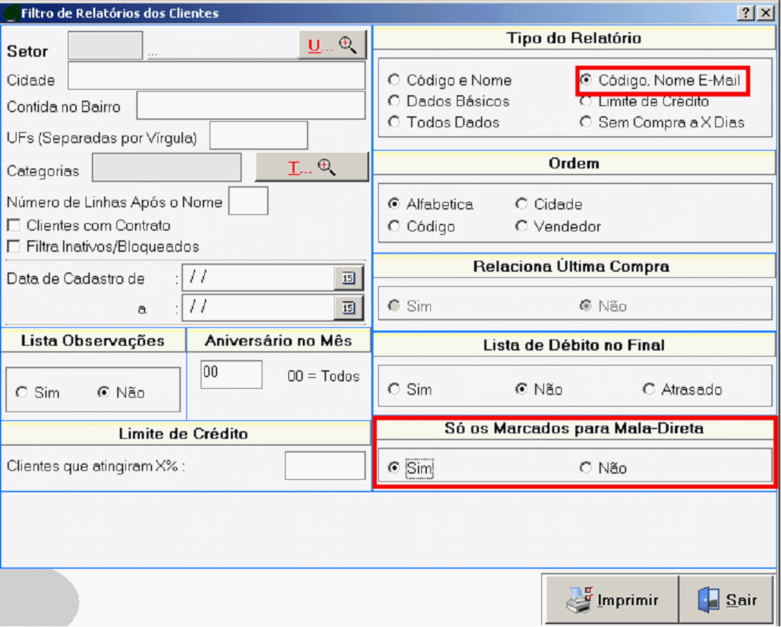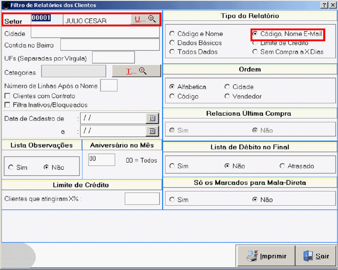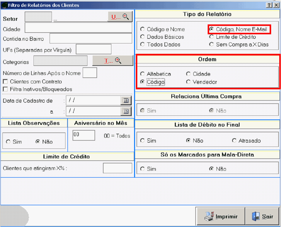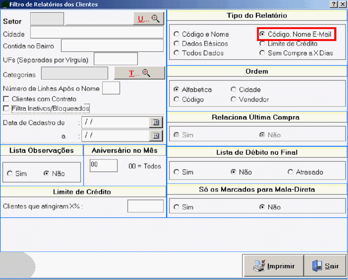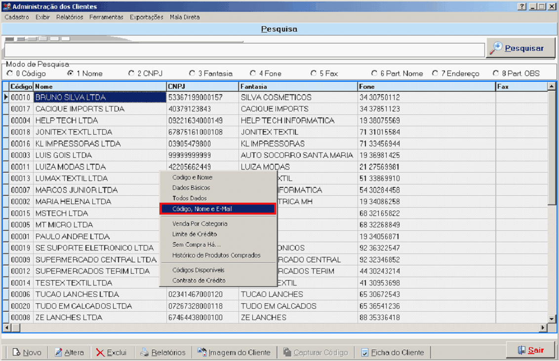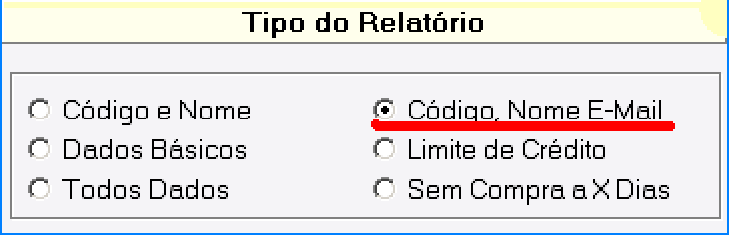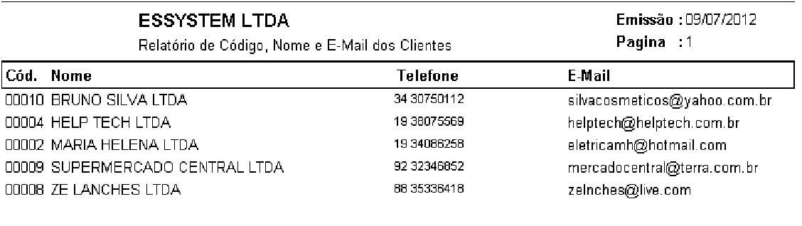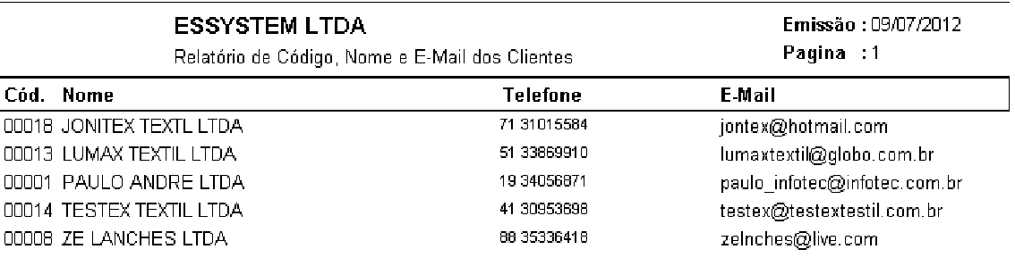 Relação de código, nome, e-mail, pode ser impresso em Ordem Alfabética, em Ordem de Código, Ordom de Cidades e Ordem de Vendeeor. Ex: Relatório em Ordem Alfabética.
