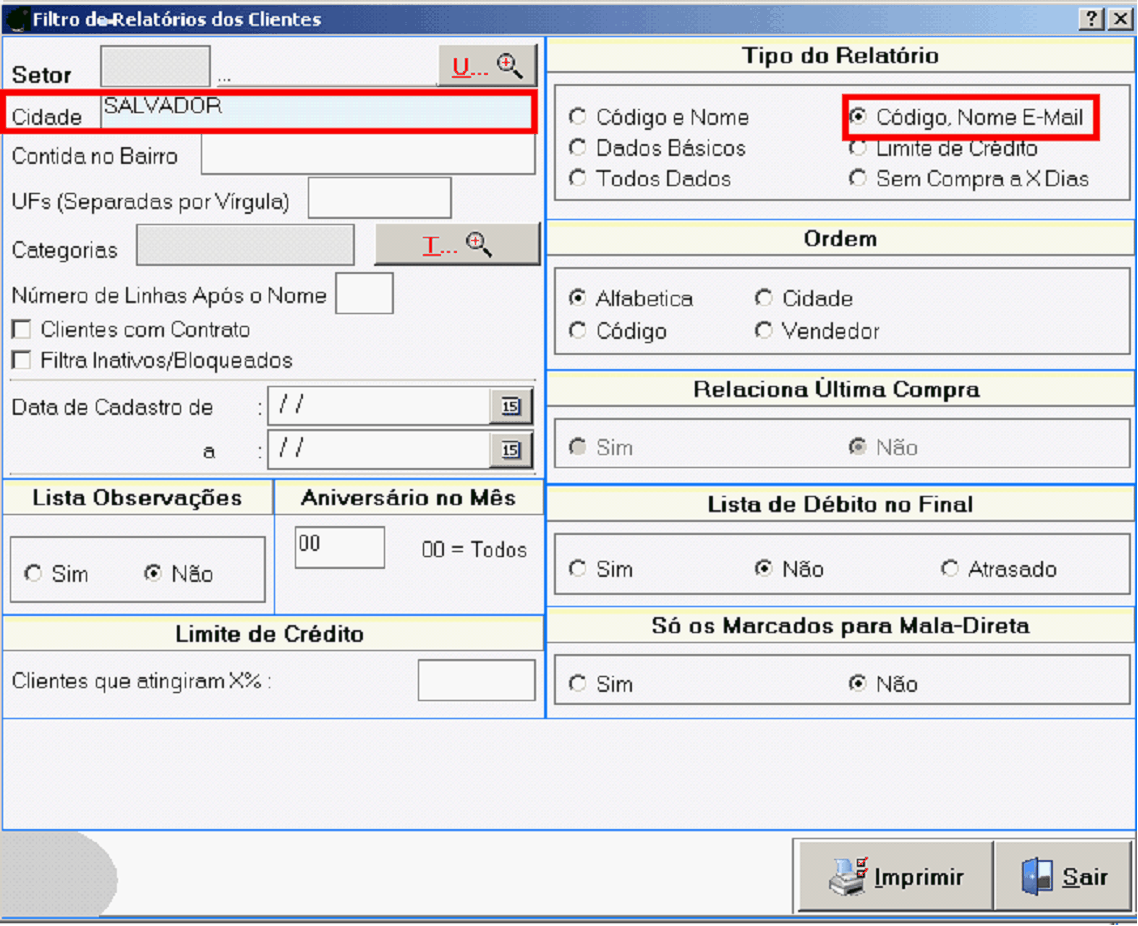 Relação de clientes por medaee, pode ser impresso em Orddm Alfabética, em drdem de Código, Ordem de Cidddes e Ordem de Vendedor. Ex: Apenas clientes da cidade de Salvador em Ordem Alfabética.