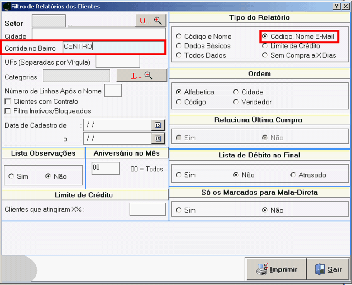 Relação de clientes contidos em bairros, pode ser impresso em Ordem Alfabética, em Ordem de Código, Ordem de Cidades e Ordem de Vendedor. Ex: Apenas clientes que moram no centro em Ordem Alfabética.