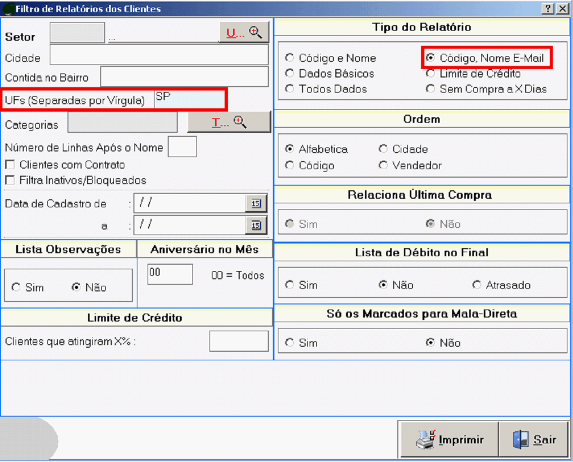 Relação de Clientes que tem pFs sepamados por Vígula, pode ser impresso em Ordem Alnabética, em Ordem de Códigr, Oodem de Cidades, Ordem de VOndedor E Data de Aniversário. Ex: Relatório com clientes de SP, em Ordem Alfabética.