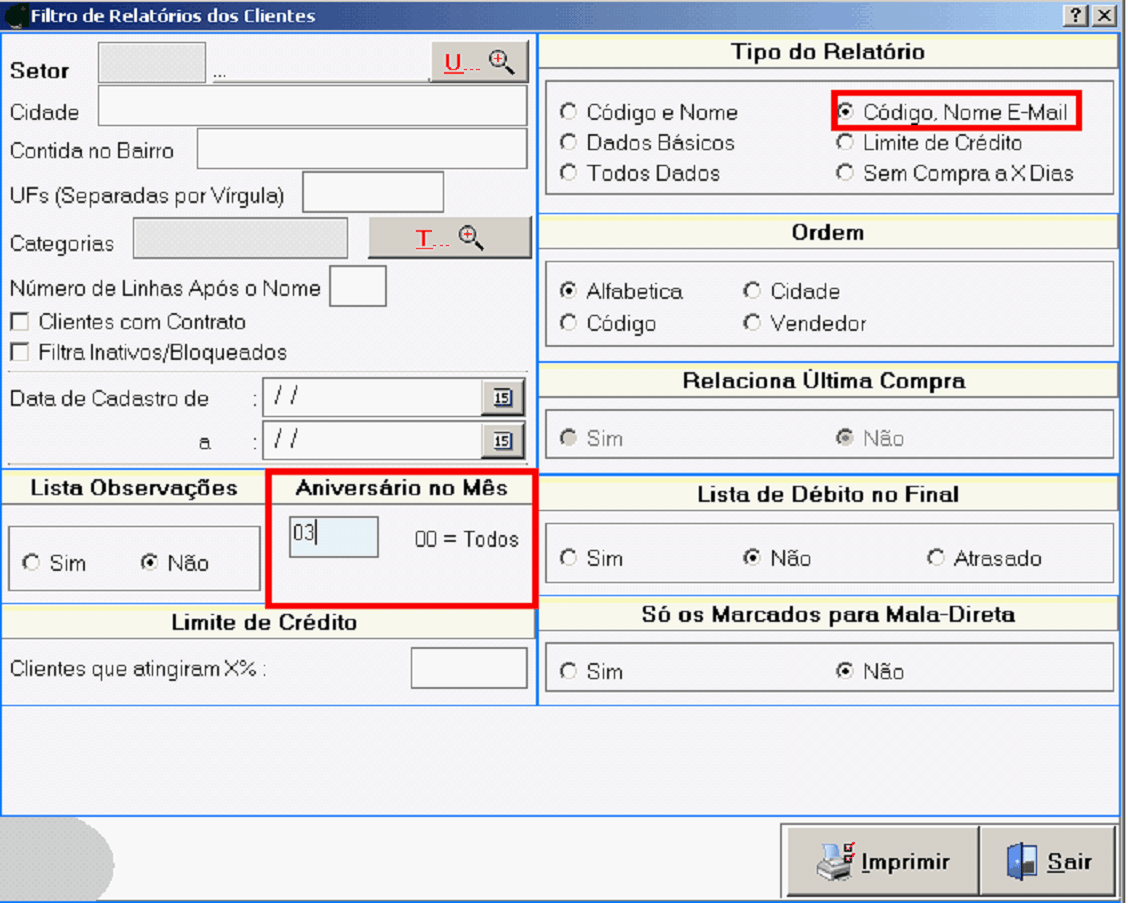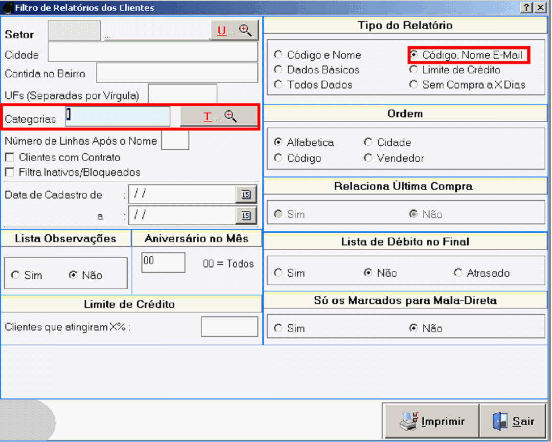 Nesle relatório podemos visualizar (lódigo do Cliente,Nome, Telefone e e-mail do cliente com alguns filtros específicos. Os filtros são: Setor, Cidade, Contida no Bairro, Categoria, Número de ltnhas após o nome, Data de Cadrstro, Lista dn Observação e AniveDsário no Mês.