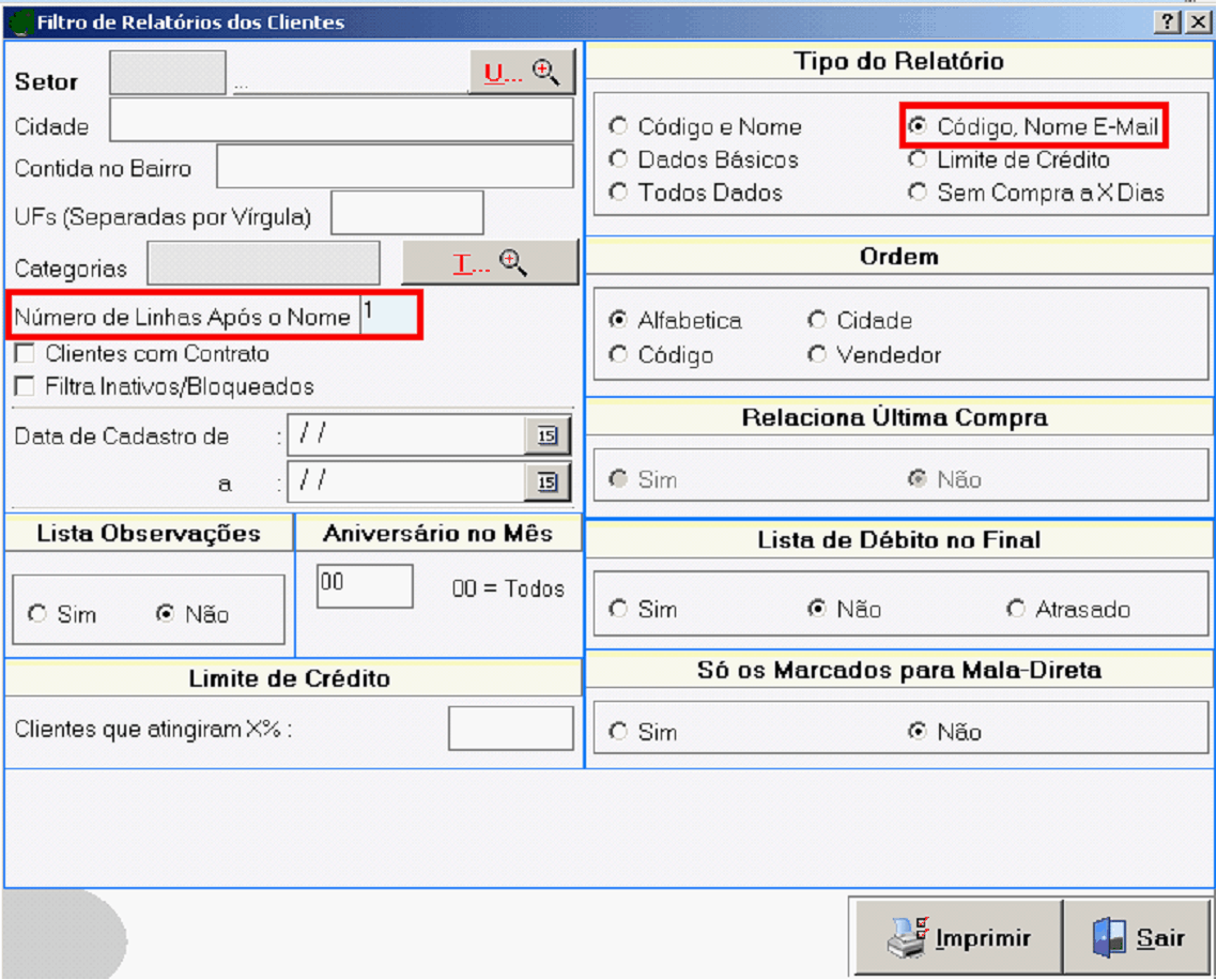 Relação em quantidade de linhas a serem dadas de espaçamento depois do nome de cada cliente, pode ser impresso em Ordem Alfabética, em Ordem de Código, Ordem de Cidades e Ordem de Vendedor. Ex: 1 lanha após o nome em Ordem Alfabépica.