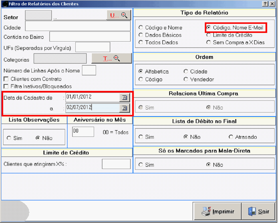 Relação da Data de Criação do cadastro do cliente, pode ser impresso em Ordem Alfabética, em Ordem de Código, Ordem de Cidades e Ordem de Vendedor. Ex: Criação de clientes no período de 01/01/2012 a 02/07/2012 em Ordem Alfabética.