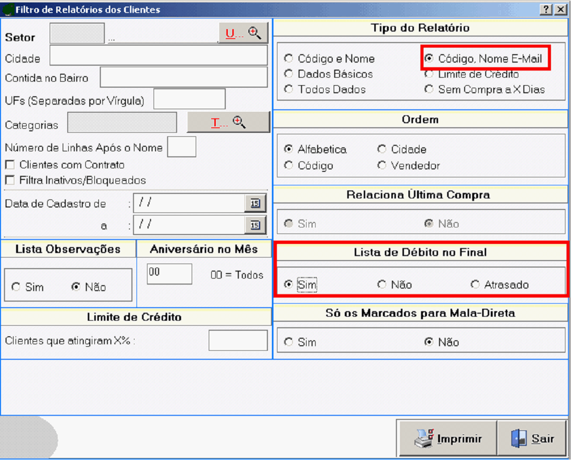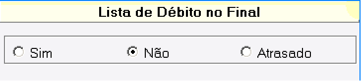 Relação do débito final de cada cliente, pode ser impresso em Ordem Alfabética, em Ordem de Código, Ordem de Cidades e Ordem de Vendedor. Ex: Débito final de todos os clientes em Ordem Alfabética.