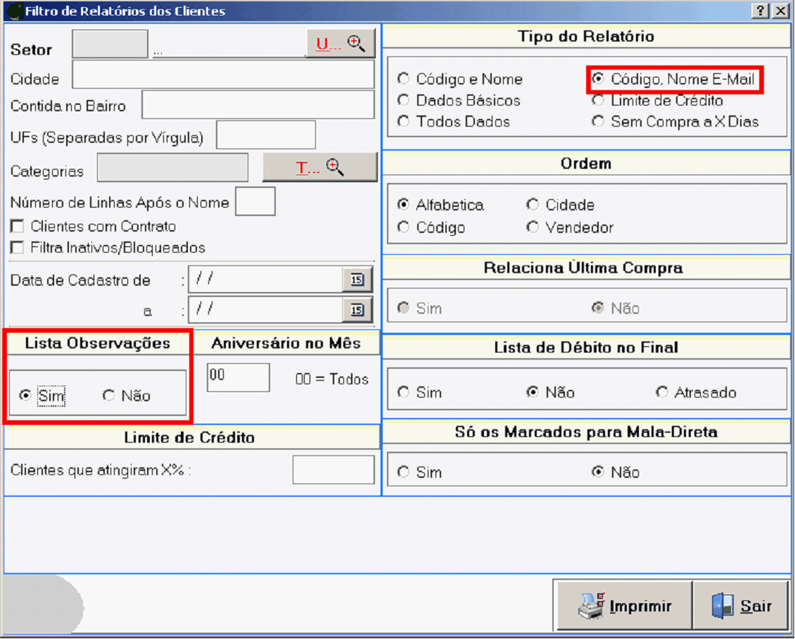 Relação com a lista de observações apenas, pode ser impresso em Ordem Alfabética, em Ordem de Código, Ordem de Cidades e Ordem de Vendedor. Ex: Lista de observações em Ordem Alfabética.