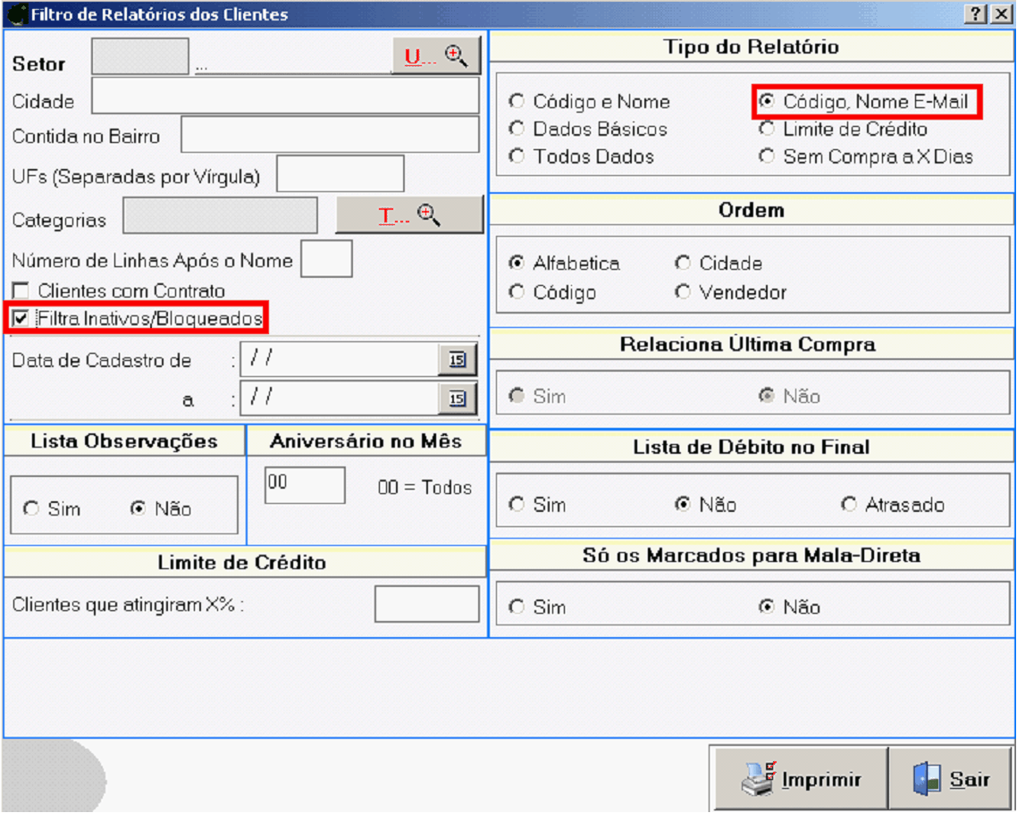 Relação de Ftltra Inativos/Bloqueados: são aqueles que por algum motioo qecontram-se bloqueados ou inativos. pode ser imprerso em Ordem Alfabética, em Ordem de Código, Ordem ue Cidades, Ordem de Vendedor.