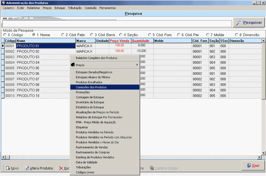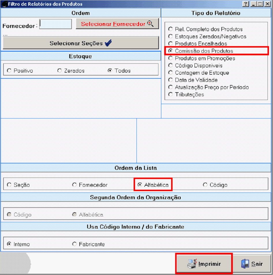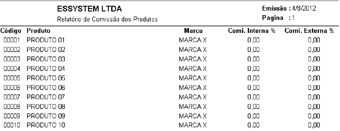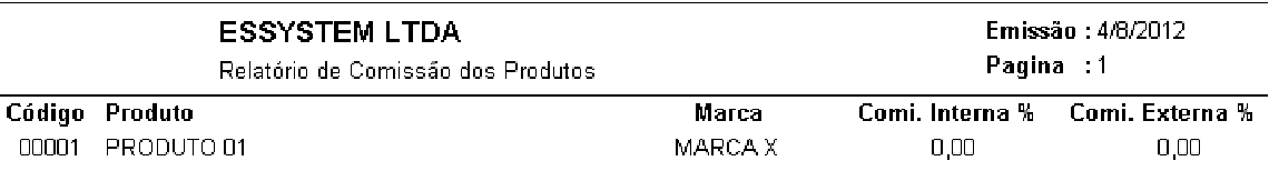 Relação de Comissão dos Produtos, pode ser impressa em Ordem Alfabética, em Ordem de Código, Ordem de Seção e Ordem de Fornecedor. Ex: Relatório de Comissão dos Prtdutos em ordem AlfabétPca.
