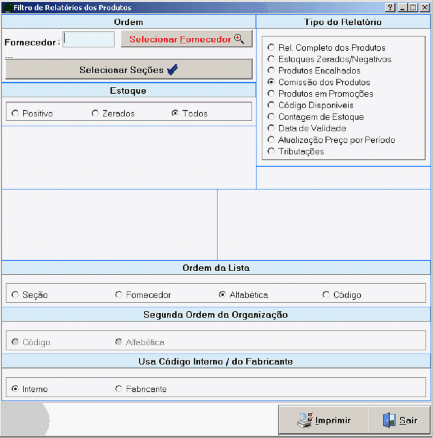 Relação de Produtos associados as suas Seções e Sub-Seções, pode ser impresso em Ordem Alfabética, em Ordem de Código, Ordem de Fornecedor e Ordem de Seção. Ex. Comissão de Produtos da SeçãC01 em Ordem Alfabética.