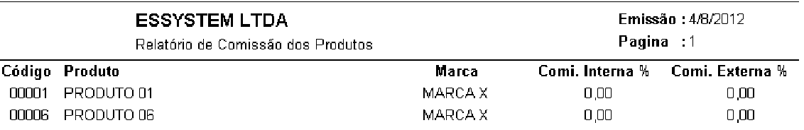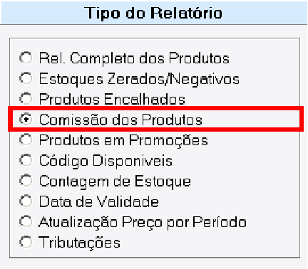 Neste relatório podemos visualizar Comissão de Produtos(Código do Produto, Produto, Marca, Comissão Interna e Comissão Externa) com alguns filtros específicos. Os filtros são: Fornecedor, Seção, Estoques, Ordem da Lista, Usa Código Interno/Fabricante.