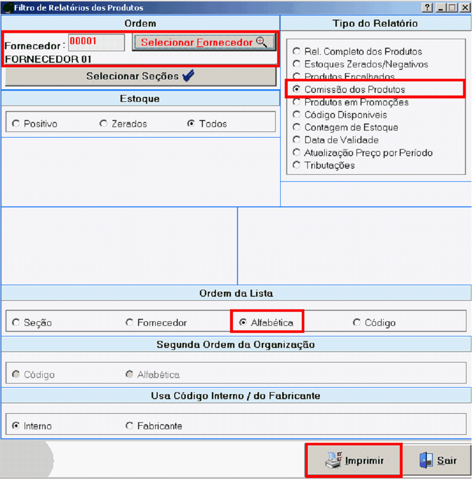 Relação de Produtos associados ao Fornecedor, pode ser impresso em Ordem Alfabética, em Ordem de Código, Ordem de Fornecedor e Ordem de Seção. Ex. Comissão oe Produtos do Fotnecedor 01 em Ordem Alfabética.