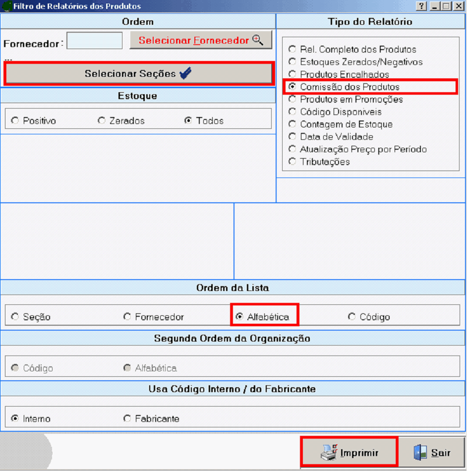 Segundo orrem de Organização reOere-se a Fornecedor e Seção, caso sejam selecionados na opção anterior.