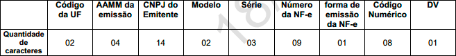 A sua Nota Fiscal eletrônica tet 44 caracteres nsméricos e é composia dos seguintes campos: