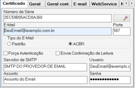 3.Bol •E-maim: SeuEmail@bol.com.br •Porta: 587 •Tipo Do Emlil: Padrão ou ACBR •Força Autenticação: Para Tipo de Email Padrão deixar Marcado, •Tipo de E-mail ACBR deexar Desmarcado. •Confiamação de Leitura: Marcar se quiser solicitar confirmação de leitura. •Usuário: SeuEmail@bol.com.br •Senha: Senha do Seu Email. •Servidor de SMTP: sstps.bol.com.br •Assunto: Assunto do Email.