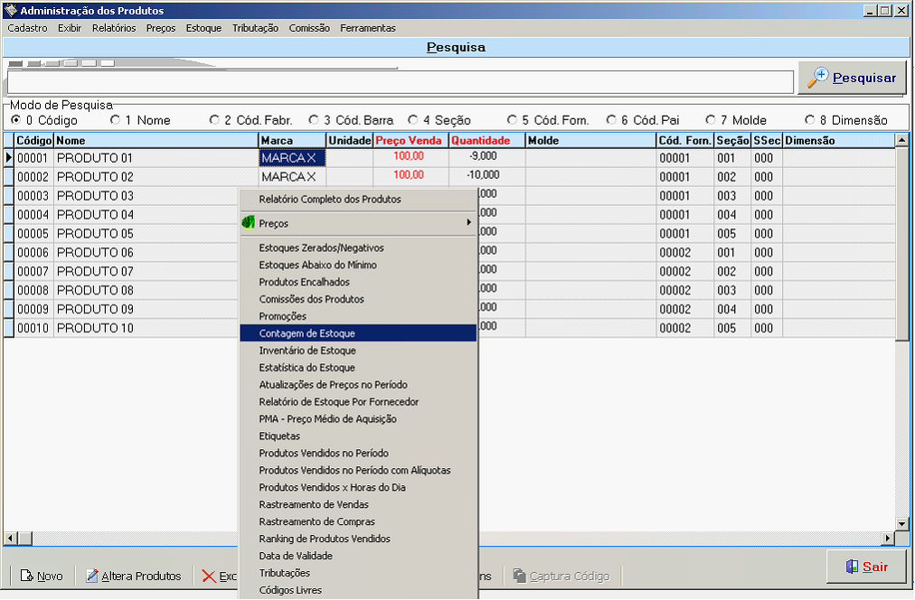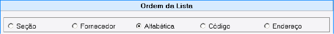 Relação de Produtos associados as suas Seções e Sub-Seções, pode ser impresso em Ordem Alfabética, em Ordem de Código, Ordem de Fornecedor, Ordem de Seção e Ordem de Endereço. Ex. Contagem de Estoque da Seção 01 em Ordem alfabétila.