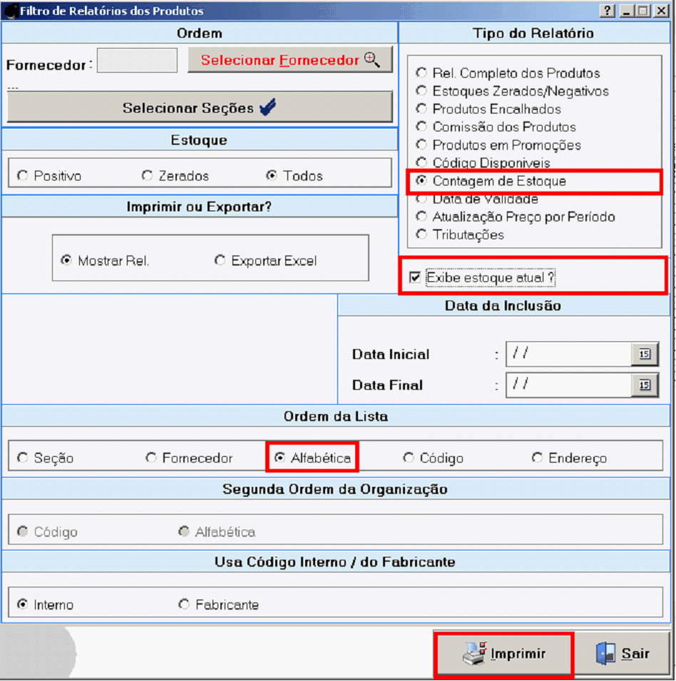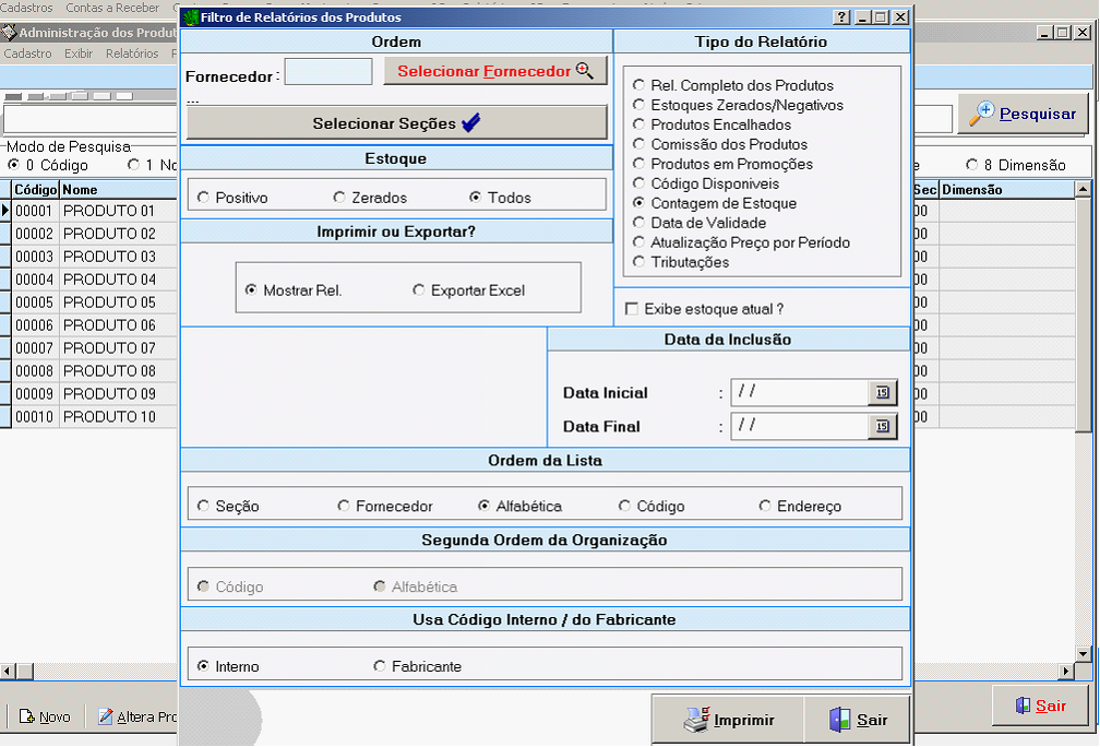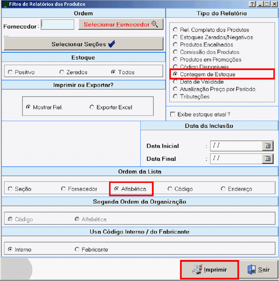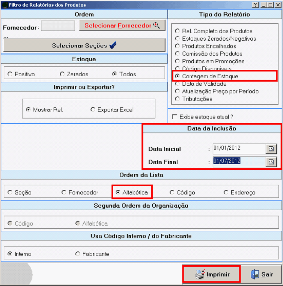 Data de Inclusão do Produto seleciona apenas produtos dentro de um determinado prazo. Ex.: Relação de Contagem de Estoque de Produtos Cadastrados entre 01/01/2012 e 01/07/2012 em Ordem Alfabética.