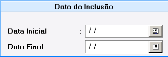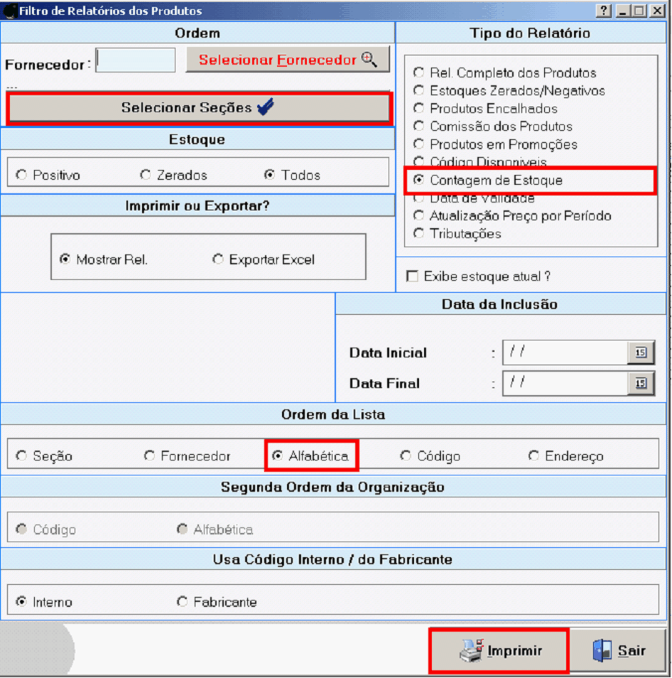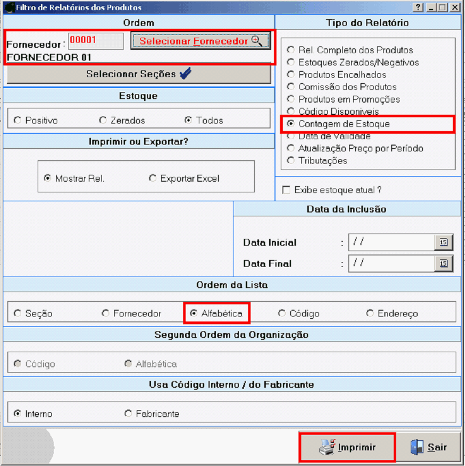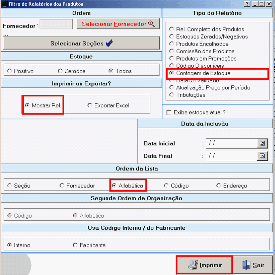 Data de Inclusão do Produto seleciona apenas produtos dentro de um determinado prazo. Ex.: Relação de Contagem de Estoque de Produtos Cadastrados entre 01/01/2012 e 01/07/2012 em Ordem Alfabética.