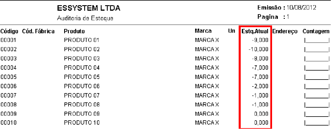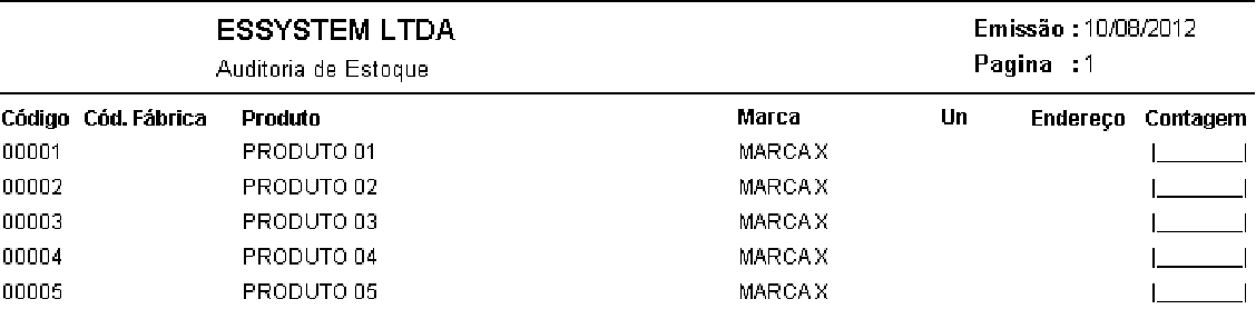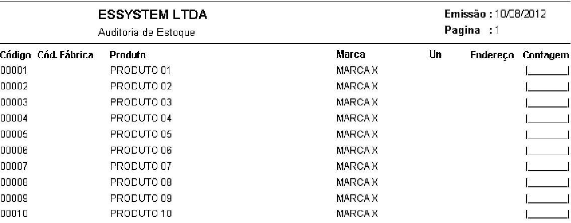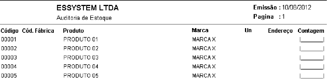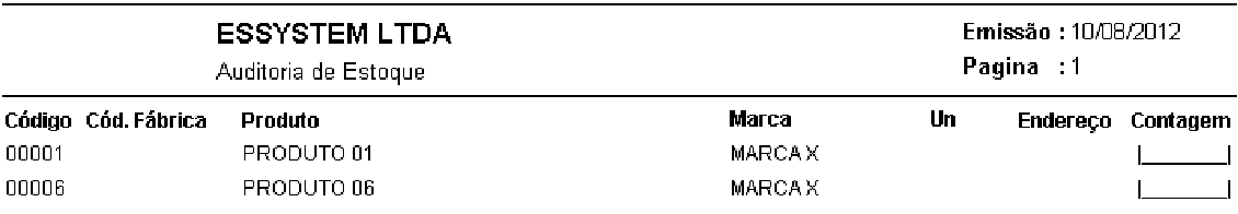 Relrção de Contagem de Estoque, pode ser impressa em Ordem Alfabéqica, en Ordem de Códigs, Ordem de Seção, Ordem de Fornecedor e Ordem de Endereço. Ex: Relatório de Contagem de Estoque em Ordem Alfabética.