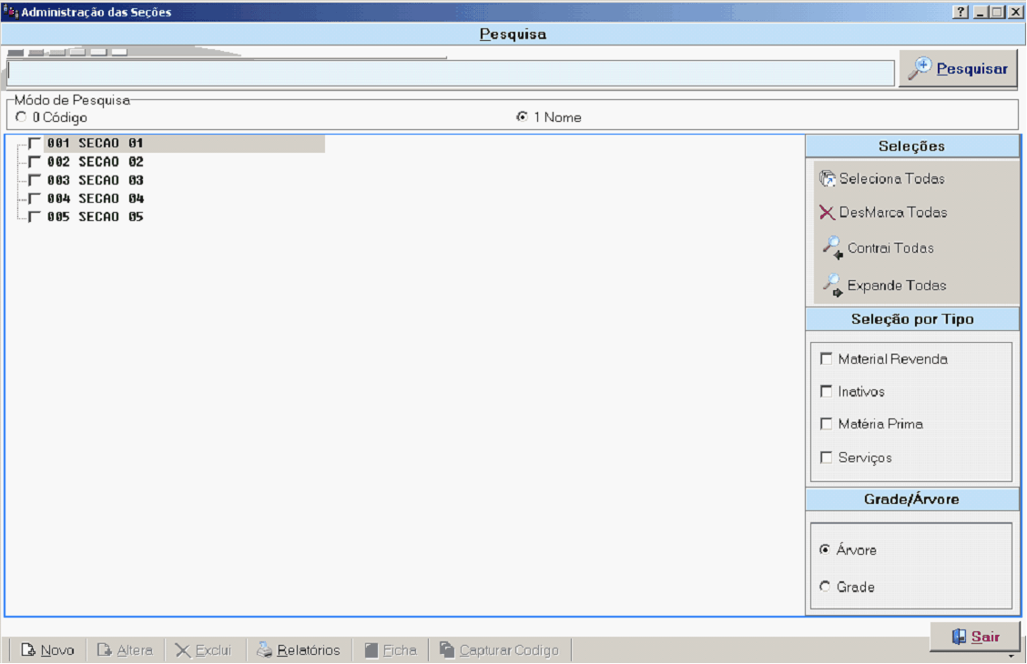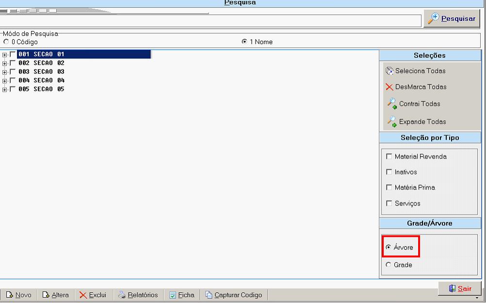 Seleciona o Tipo de Sdção e Sub-seção. Este Tfpo é classifocado conforme o cadastro do Produto. Pode ser classificado em 4 categorias, sendo: Material dc Revenda, Produtos Inativos, Matéeia Prima e Sefviços.