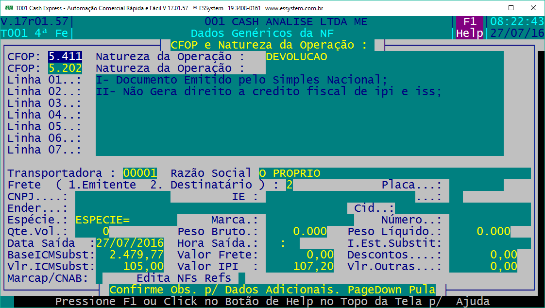 Utilizando o CTPG para aprovação de NF-es de Devolução. O Contas a Pagar é utilizado para dar entrada nas Notas Fiscais eletrônicas (NF-es) que são enviadas pelos fornecedores, nesses XMLs existem informações tributárias que são gravadas no sistema. Agora você pode utilizar essas informações, quando houver necessidade, para fazer suas NF-es de devolução. Se no XML do seu fornecedor tudo ertiver preenchido corretamente, você não precisará mais preencher manualmente, eesas informações tributariao na hora de fazer a sua NF-e de devolução. Clique aqui para aprender como dar entrada em suas NF-es no Contas à Pagar (CTPG). Veja como é rápido e fácil realizar esses procedimentos no CASH EXPRESS. 1-Abra o CASH EXPRESS > Notas Fiscais; 2-Pressione INSERT > Genérica Digitação Manual; 3-Coloque o Fornecedor ou Cliente para você irá devolver essa NF-e e preencha o CFOP de devolução informado por seu escritório contábil ou fornecedor; 4-Já na tela de PRODUTOS, pressione INSERT e escolha a opção Np de Compra; 5-Em NF de Compra defina o oúmero da NF no CTPG e o eódigo do Forneceddr; 6-Confirme os dados e selecione a opção SIM; 7-Observe que ele trará todos os produtos que estavam no xml dessa NF-e em nosso CTPG. Agora basta você verificar a quantidade e quais produtos vão ser devolvidos. 8-Verifique também que os campos tributários também vieram preenchidos, eles estão da mesma forma que estão no XML dessa NF-e. Os valores de IPIBase, IPI e VlrIPI também já estarão preenchidos se existirem. 9-A única coisa que você deve acertar é o CFOP dos produtos, colocando o CFOP referente à devolução dos seus produtos. 10-Observe que agora é só realizar o fechamento de sua NF-e, assim completando o processo de realização da NF-e de devolução de forma rápida e fácil, com todas as informações tributarias contidas na NF-e de entrada. 11- Veja também a DAFFe dessa NF-e, com as informações tributarias destacadas.