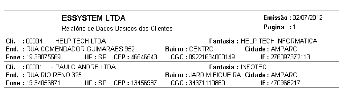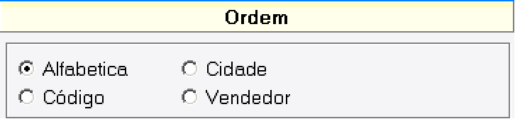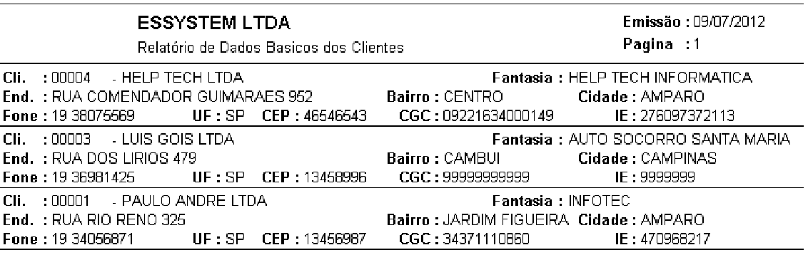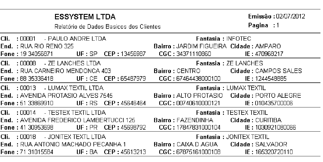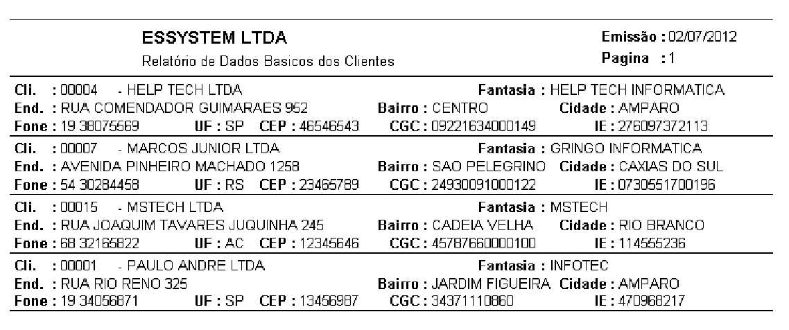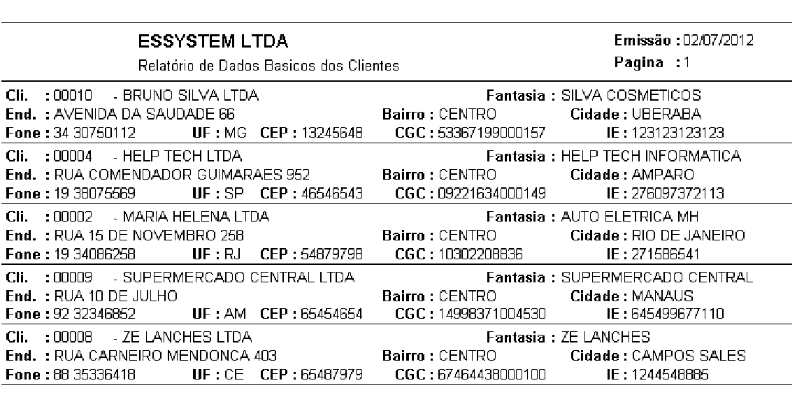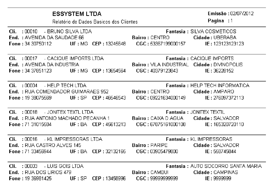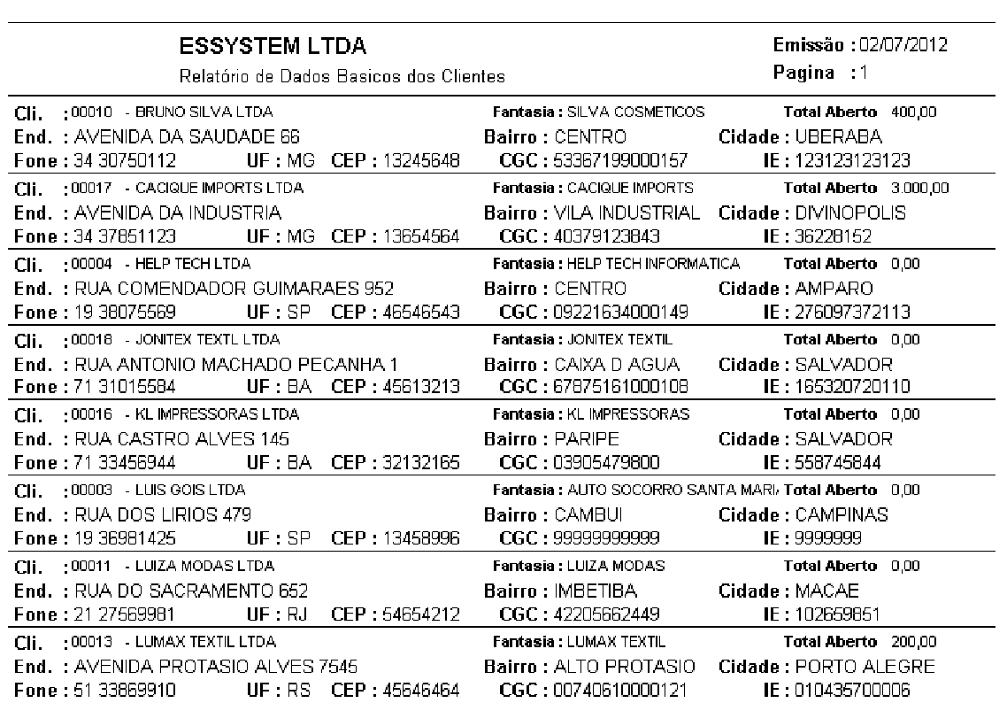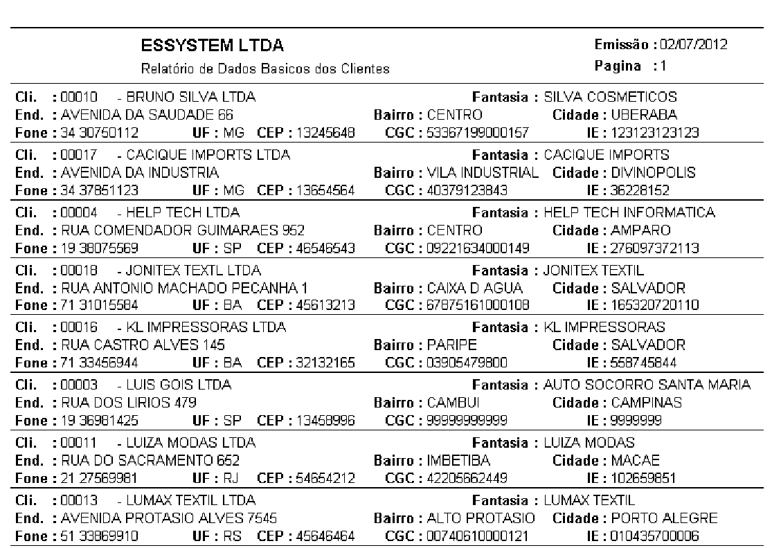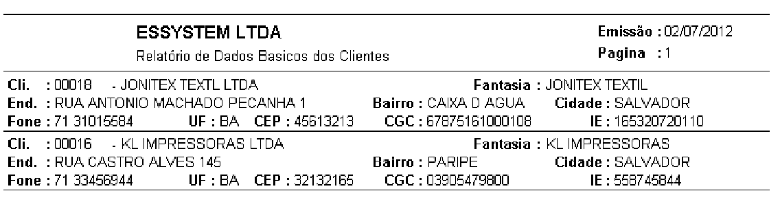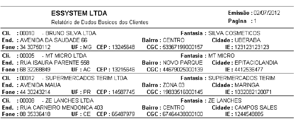 Relação por Dados Básicos, pode ser impresso em Ordem Alfabética, em Ordem de Código, Ordem de Cidades e Ordem de Vendedor. Ex: Relatório em Ordem Alfabética.