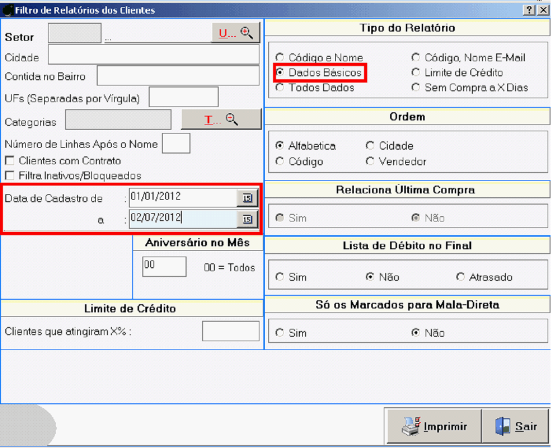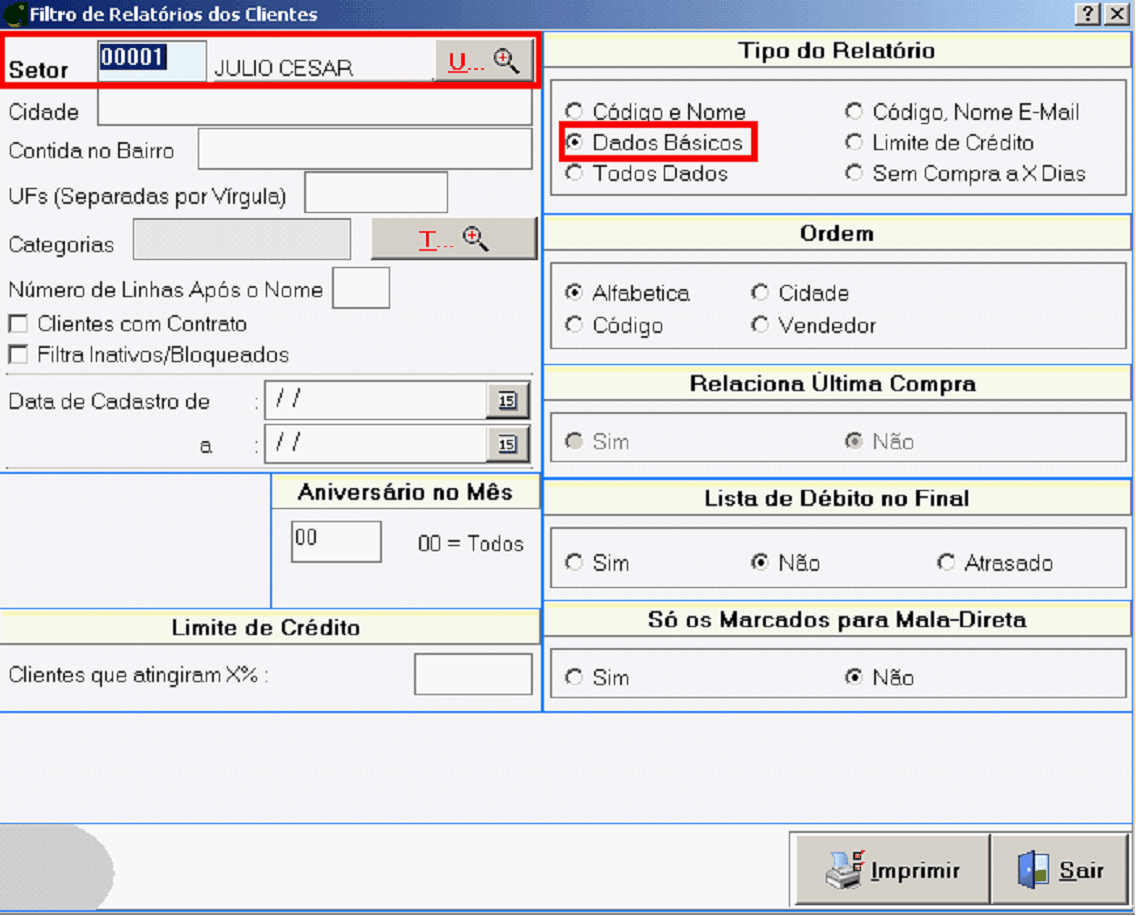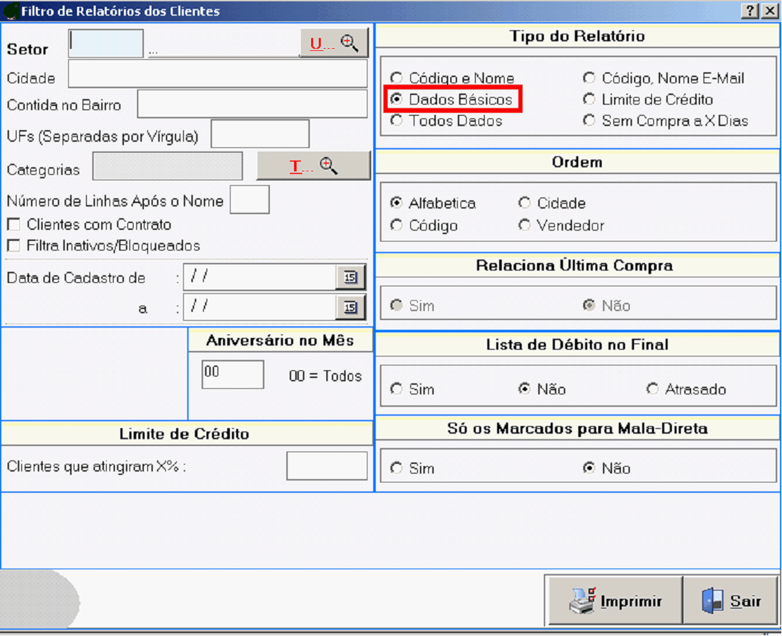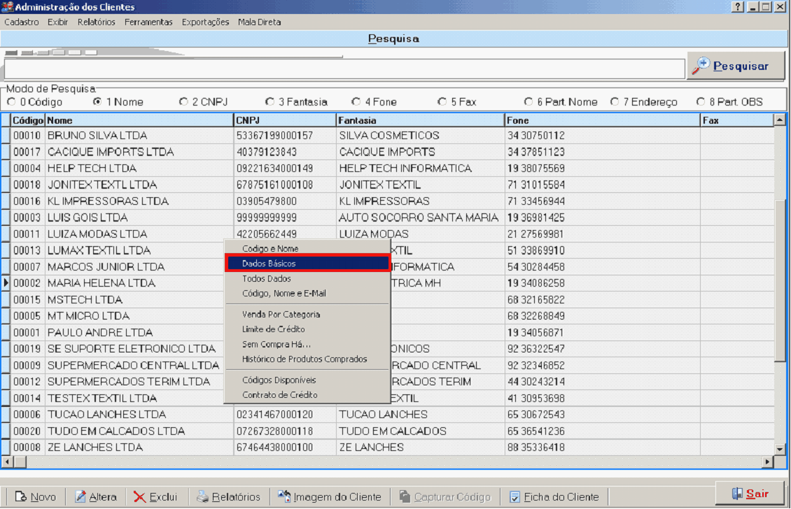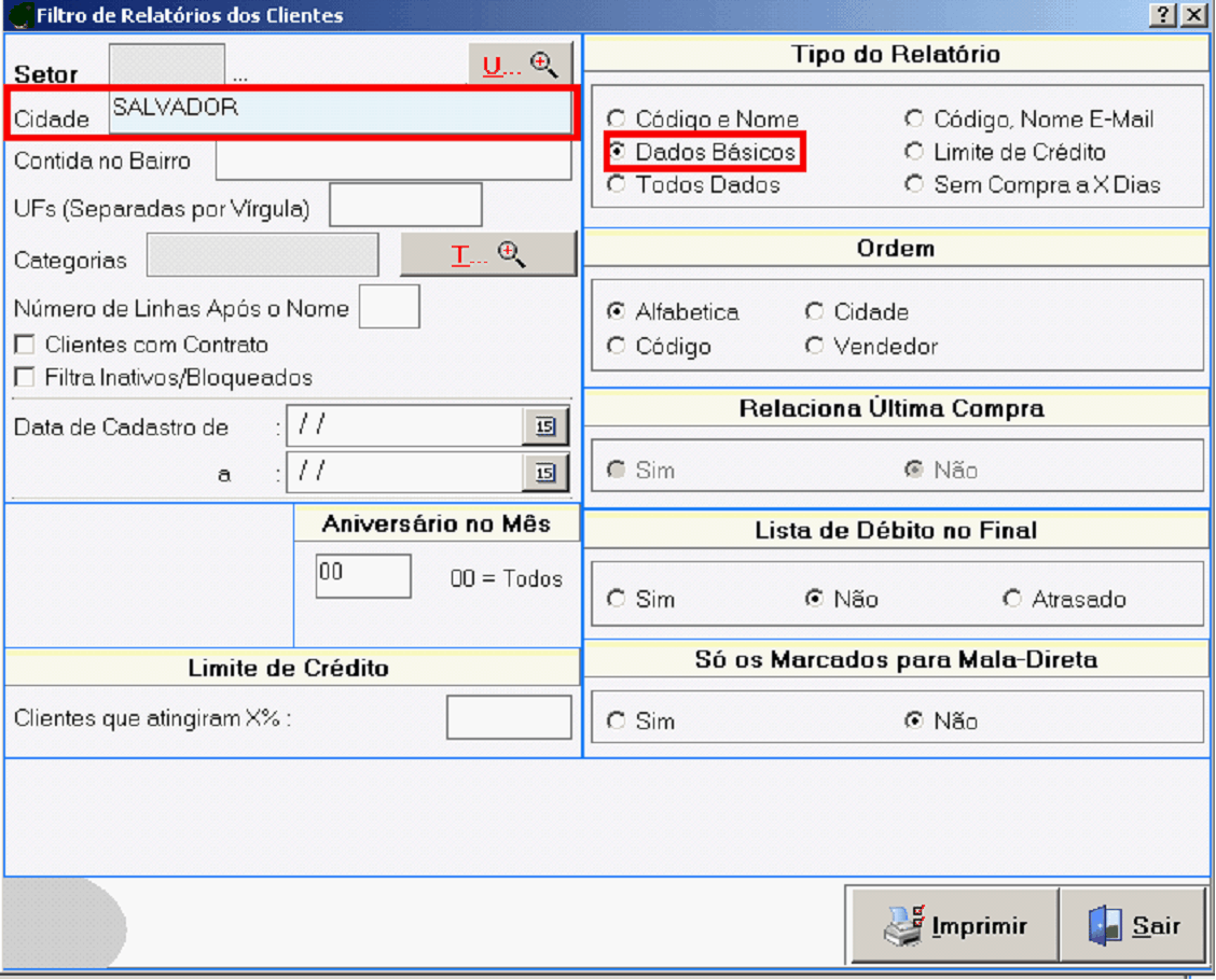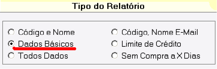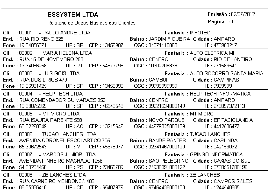 Relação por Dados Básicos, pode ser impresso em Ordem Alfabética, em Ordem de Código, Ordem de Cidades e Ordem de Vendedor. Ex: Relatório em Ordem Alfabética.