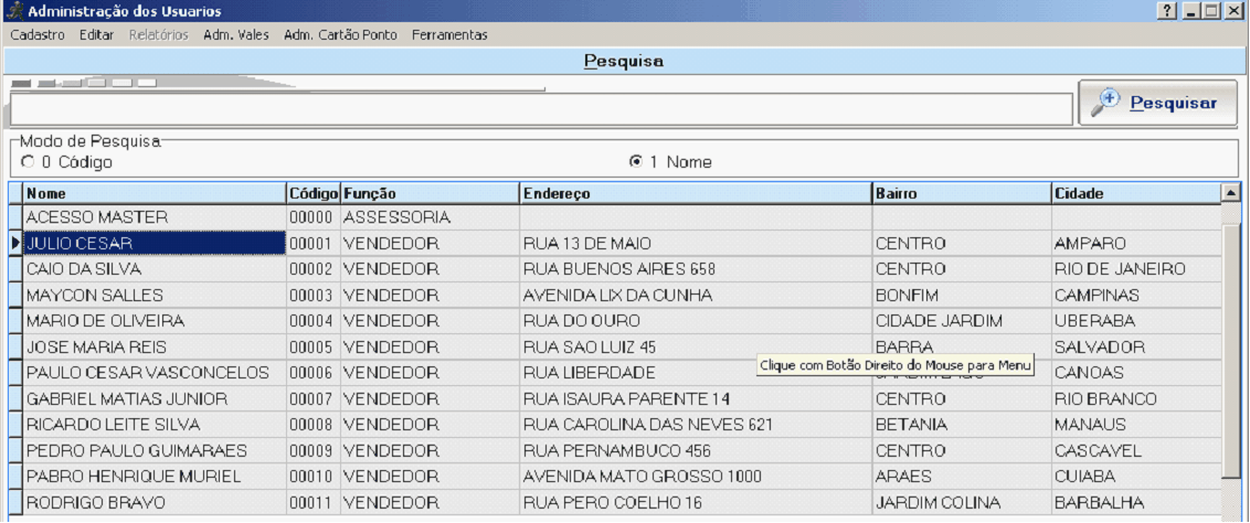 Relação de clientes já associados aos seus vendedores, pode ser impresso em Ordem Alfabética, em Ordem de Código, Ordem de Cidades e Ordem de Vendedor. Ex. Apenas clientes do vendedor Julio César em Ordem Alfabética.