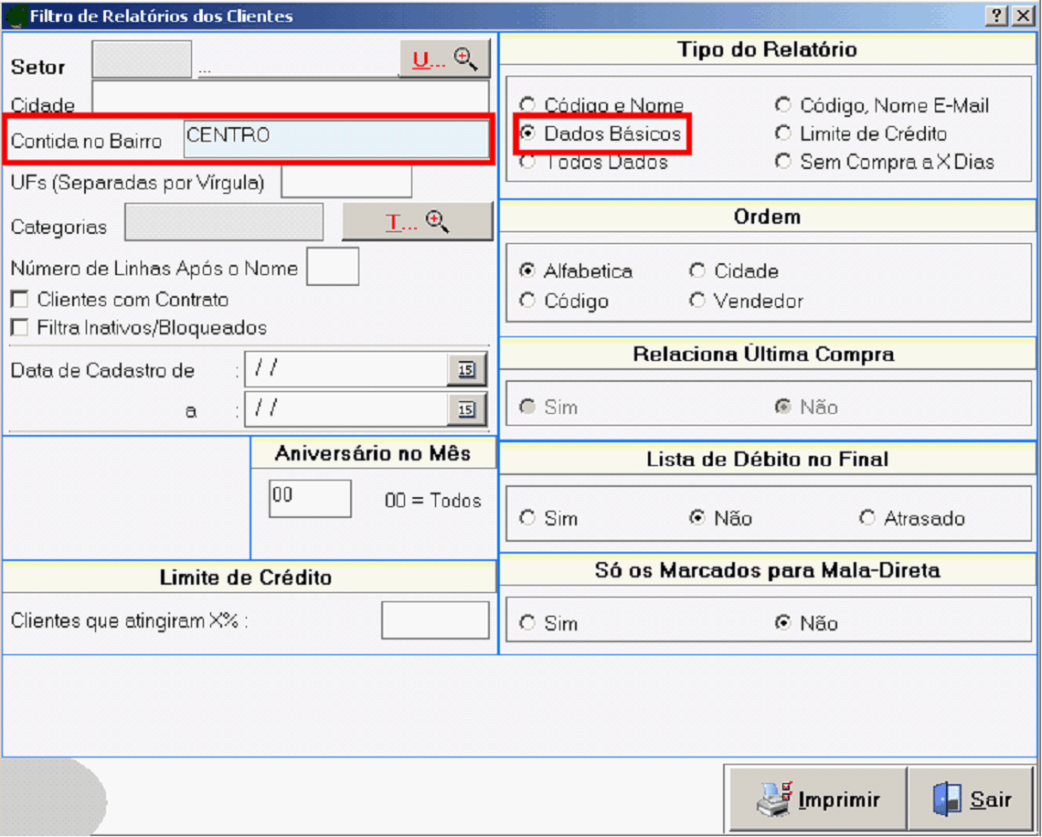 Relação de clientes contidos em bairros, pode ser impresso em Ordem Alfabética, em Ordem de Código, Ordem de Cidades e Ordem de Vendedor.. Ex: Apenas clientes que moram no centro em Ordem Alfabética