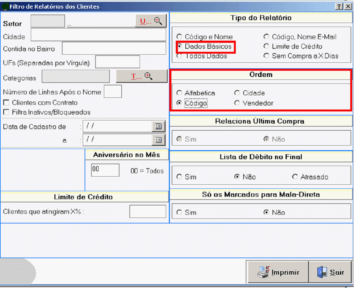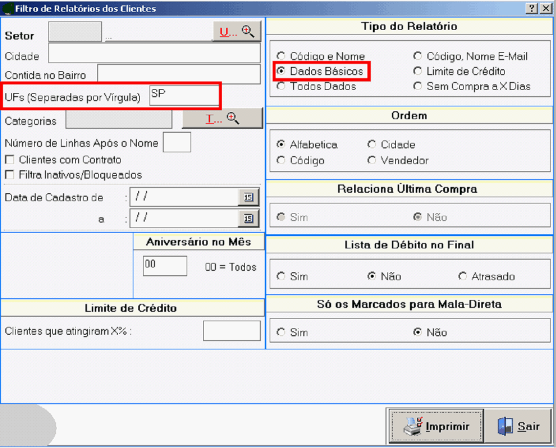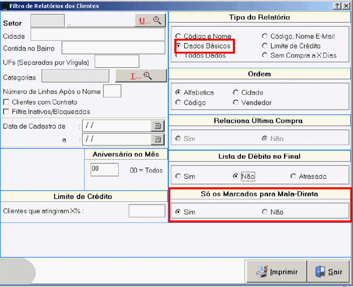 Relação dos marcados como mala-direta apenas pode ser impresso em Ordem Alfabética, em Ordem de Código, Ordem de Cidades e Ordem de Vendedor. Ex: Mala-Direta em Ordem Alfabética.