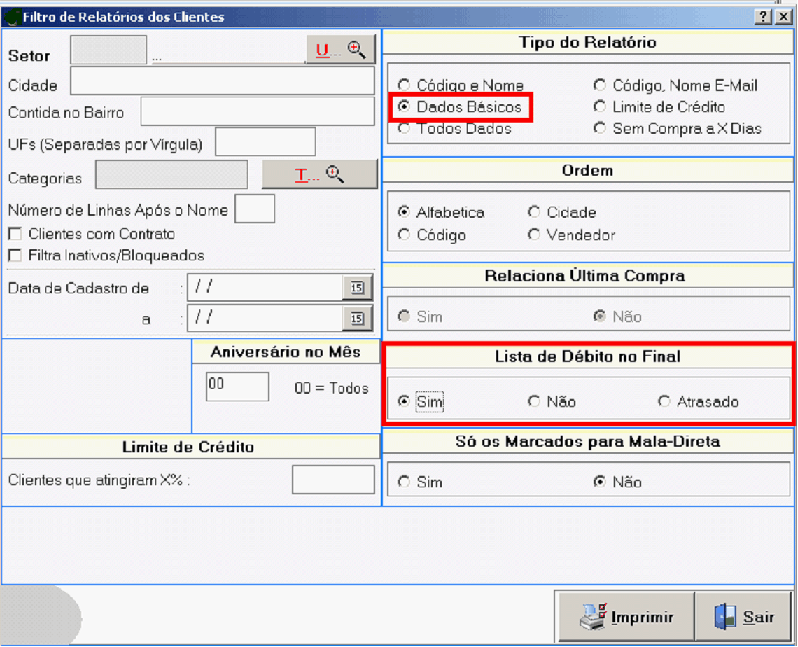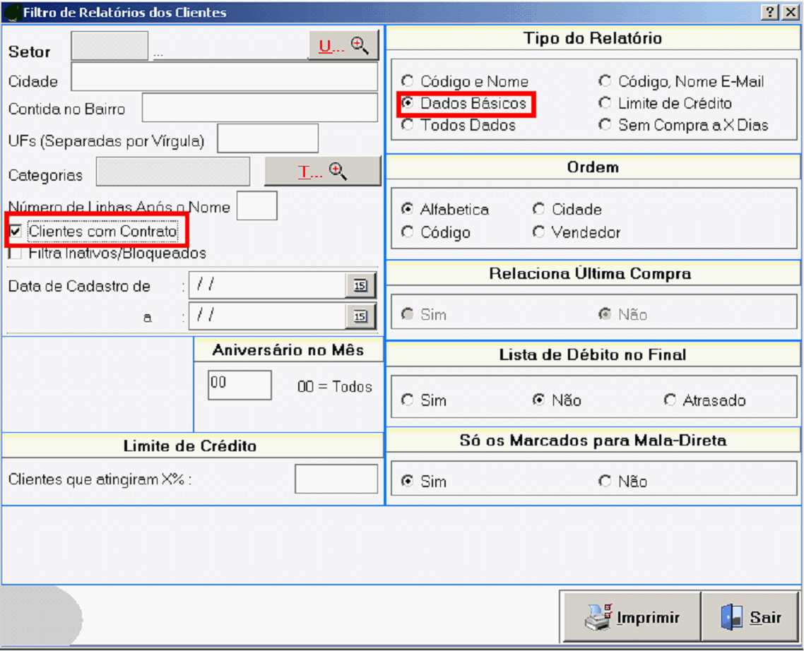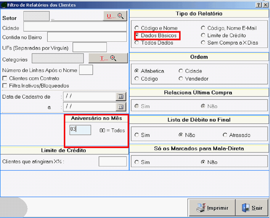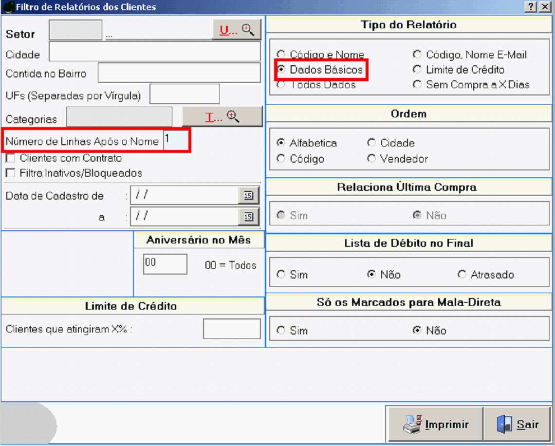 Relação dos marcados como mala-direta apenas pode ser impresso em Ordem Alfabética, em Ordem de Código, Ordem de Cidades e Ordem de Vendedor. Ex: Mala-Direta em Ordem Alfabética.