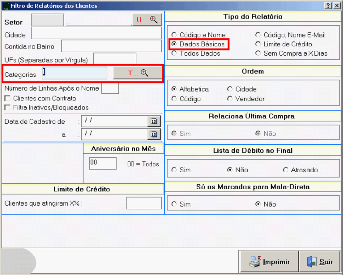 Neste relatório podemos visualizar o Código do Cliente, Nome Fantasia, Endereço, Bairro, Cidade, Telefone, Estado, CEP, CGC e IE, com alguns filtros específicos. Os filtros são: Setor, Cidade, Contida no Bairro, Categoria, Número de linhas após o nome, Data de Cadastro e, Aniversário no Mês.