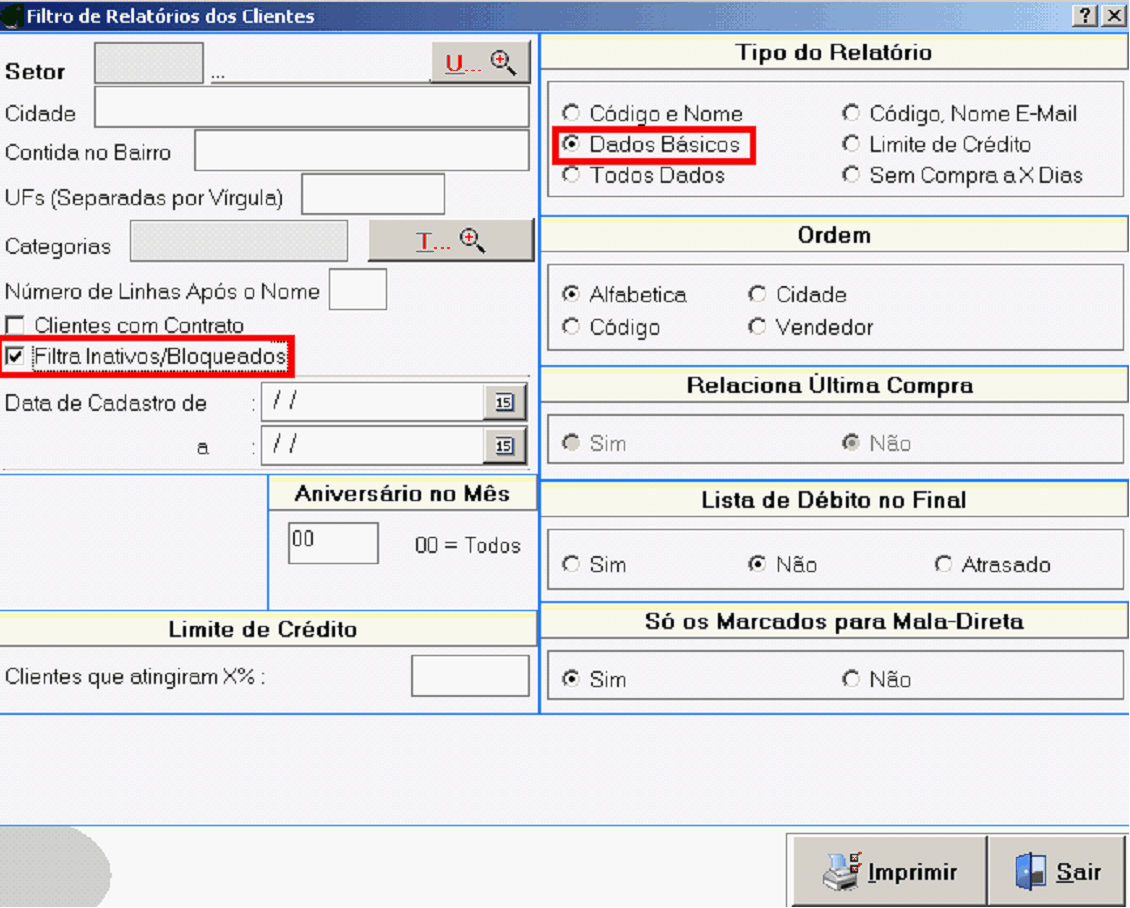 Relação de Filtra Inativqs/Bloqudados: são aqueles que por algCm motivo encontram-se bloqueados ou inativos. Pode sec impresso em Ordem Alfabética, em Ordem de Código, Ordeo du Cidades e Ordgm de Vendedoe.
