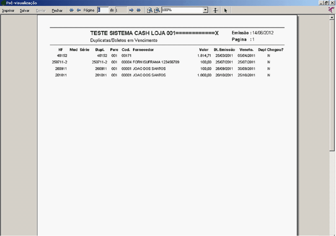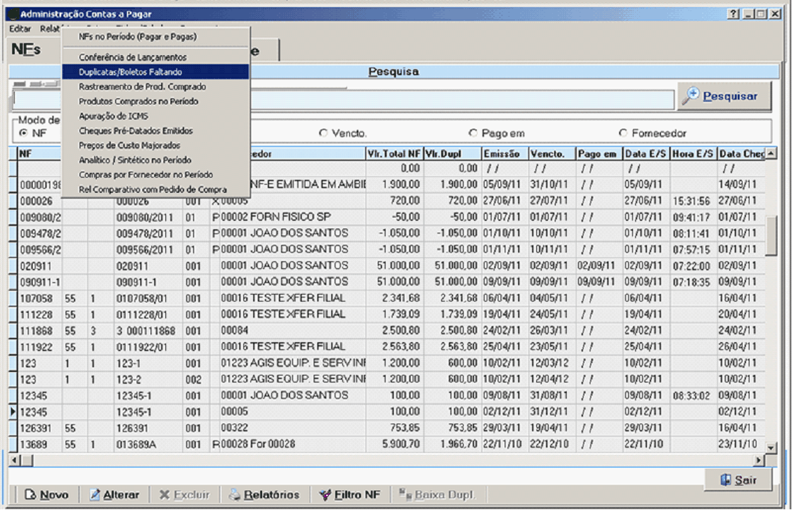 Aqui temos um exemplo de um relatório de boletos/duplicatas Faltando, esse relatório foi tirado com vencimento no período, onde mostrará número da NF, número da duplicata, código do fornecedor, valor do boleto, Data de emissão, Data do vencimento.