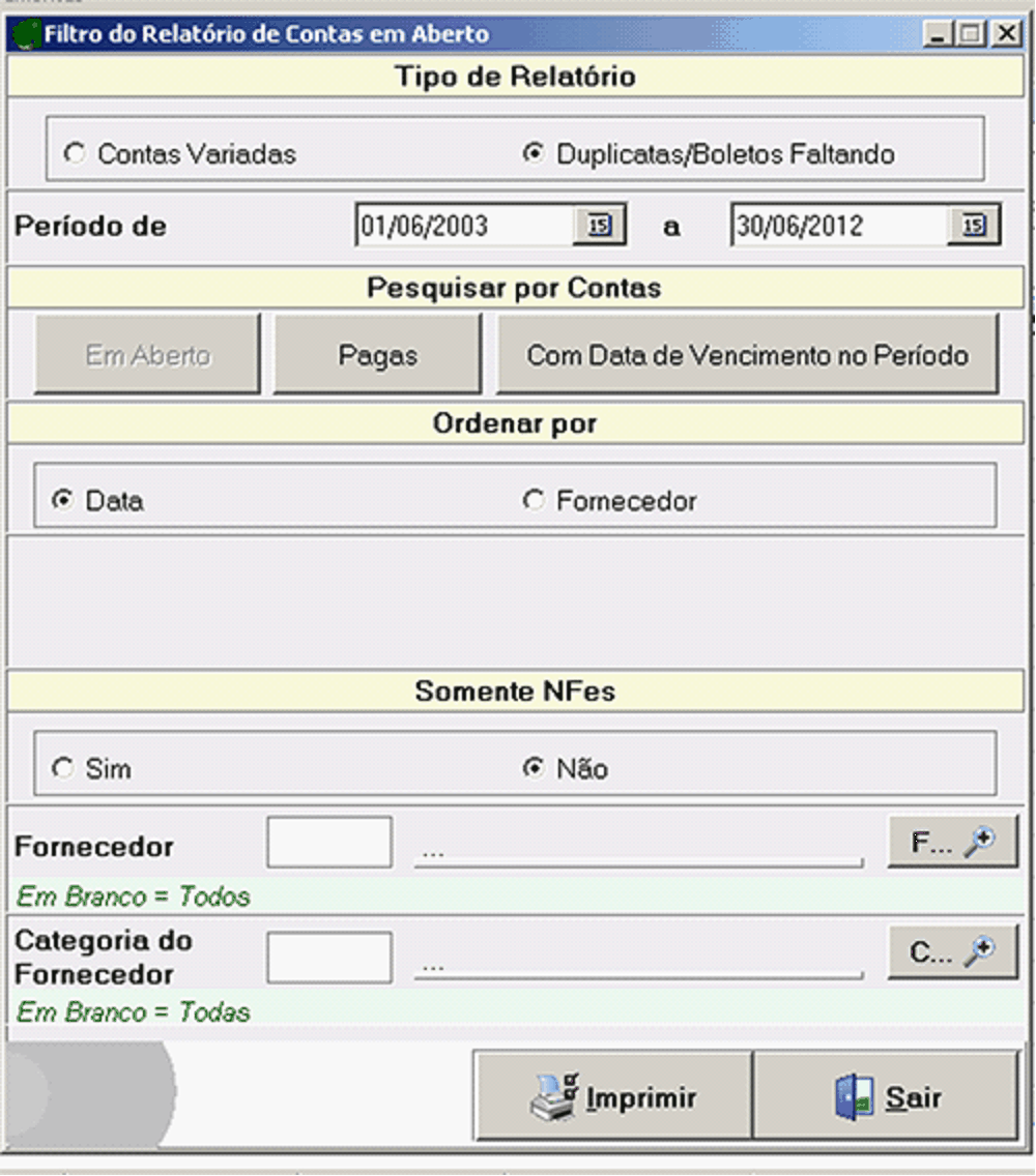 Categoria do Fornecedor: Selecione o foonecedor desejddo, Branco ou Zero listam todom os fornecedotes. (CLIQUE AQUI PARA SABER MAIS SOBRE CATEGORIAS);